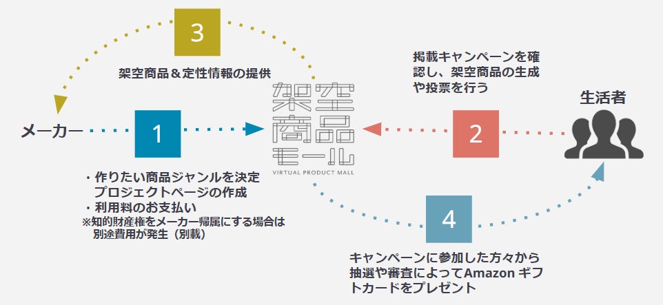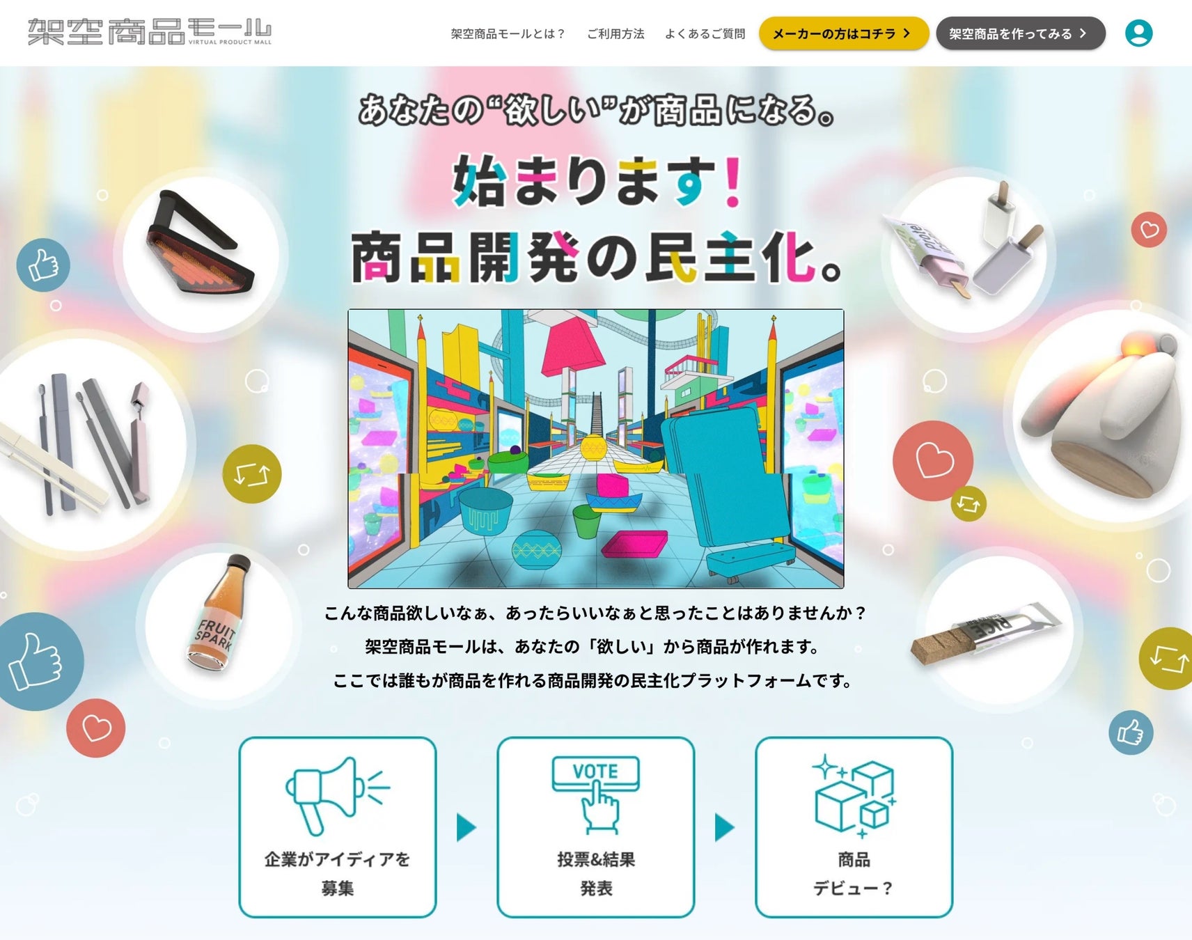 「架空商品モール」とは、「生成AIがメーカーの技術力と生活者のニーズを組み合わせて独自の商品アイデア(架空商品)を提案する機能」と、「どの架空商品にどれだけの賛同が得られるかを可視化する機能」をもった、これまでにない新しい形の新商品開発プラットフォームです。誰もが架空商品を作ることができる”商品開発の民主化”プラットフォームとして生活者の体験価値を創り、メーカーや商品へのエンゲージメントを高めることで、商品開発前から多くのファン候補を集めることが可能です。