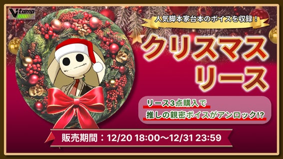 クリスマスリースとは、クリスマスにぴったりなリース型のデジタルグッズで、「推しと一緒にクリスマスリースを作った思い出」をテーマにした各活動者のボイスを収録しています。本商品を3点購入すると、ドキドキする展開が味わえる「親密版ボイス」の特典がアンロックされる仕組みとなっており、よりファンの皆さんにお楽しみいただける内容となっています。※3