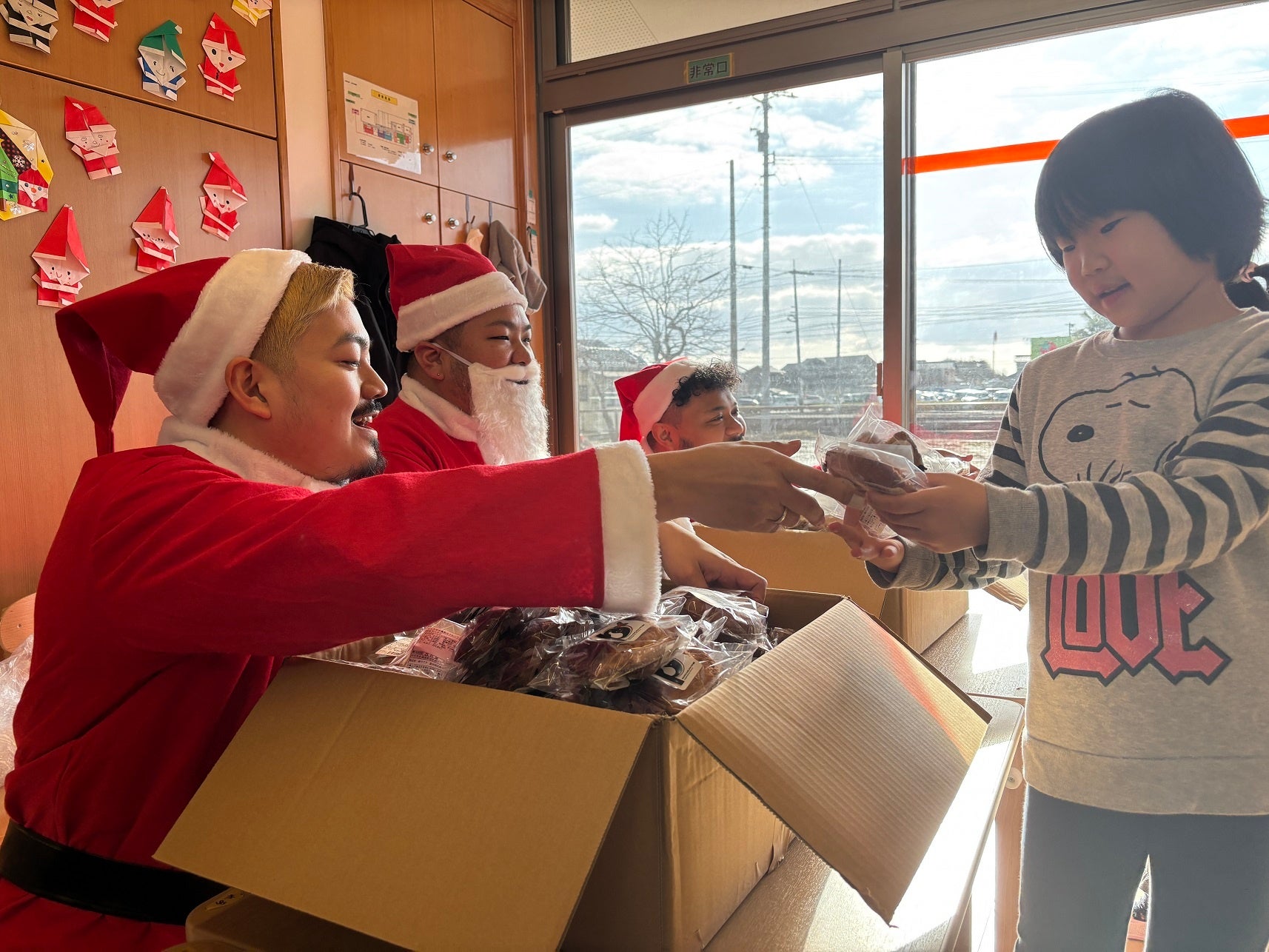 協力いただいたのは、石川県金沢市発祥のドーナツ店「ウフフドーナチュ」で、能登の希少な大豆を使った「大浜大豆のきなこドーナツ」と、能登のひらみゆき農園とコラボした「ブルーベリードーナツ」を、「PEACEFUL PARK 2024 for 能登」にもオープニングアクトとして出演したコーラスグループのQUMANOMIのメンバーがサンタの格好に扮し、能登地域の子どもや被災した方々に配りました。