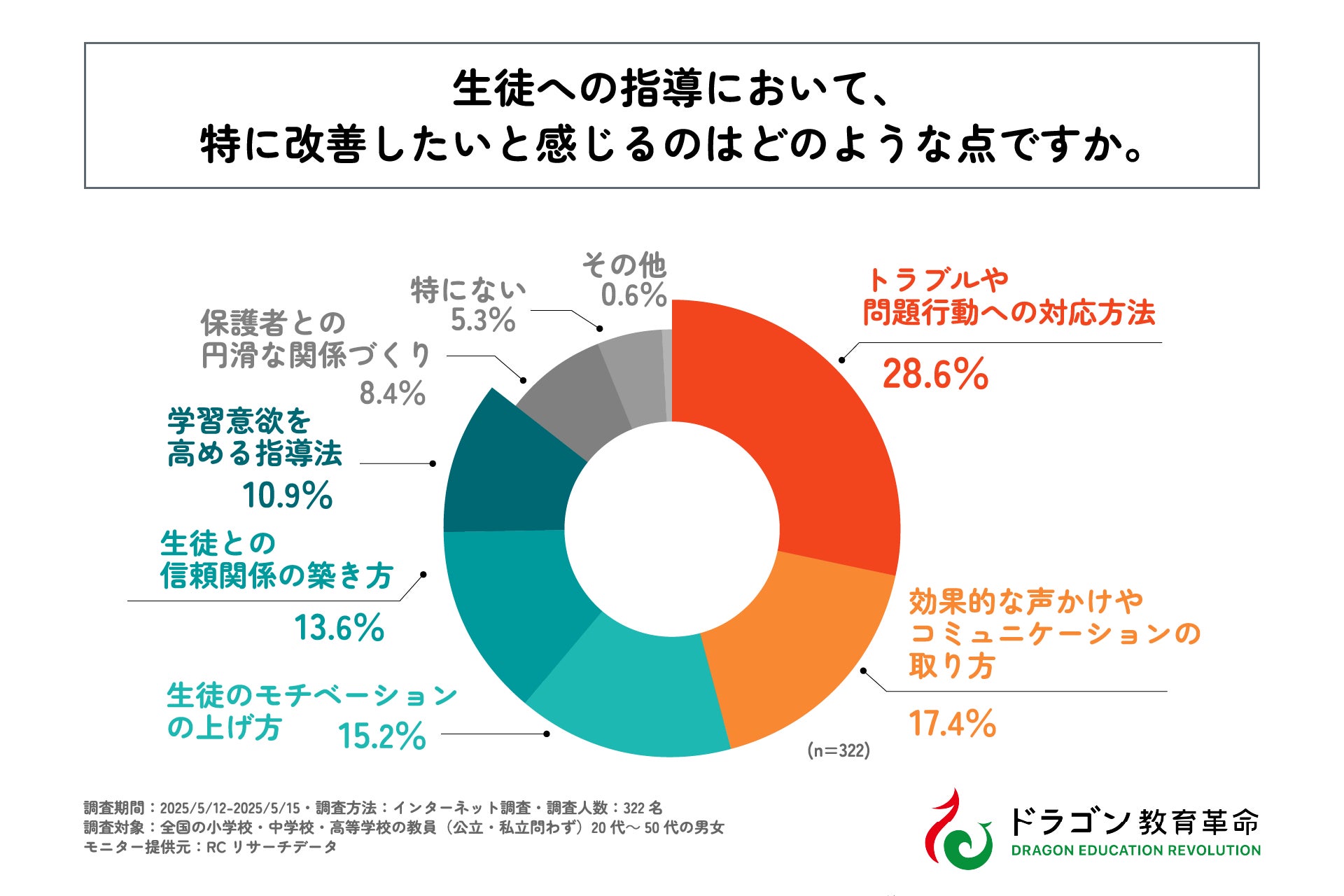 6月は、新年度の慌ただしさが一段落し、生徒も教員も徐々に新しい環境に慣れ始める時期です。一方で、教育現場では、生徒への指導や人間関係に関する悩みや課題が徐々に顕在化してくる時期でもあるものと思います。近年、「モンスターペアレント」といった言葉も話題になりましたが、保護者はもちろん、生徒自身も時代に合わせて価値観や考え方が変わるため、教育現場で働く教員の方々は日々、どのように生徒を指導していけばよいか、悩んでいる方も少なくないのではないでしょうか。そこで「ままためコーチング塾」を運営する株式会社ドラゴン教育革命は、教育機関で働く教員の方々を対象に「教員の生徒指導実態とキャリア観」に関する調査を実施しました。