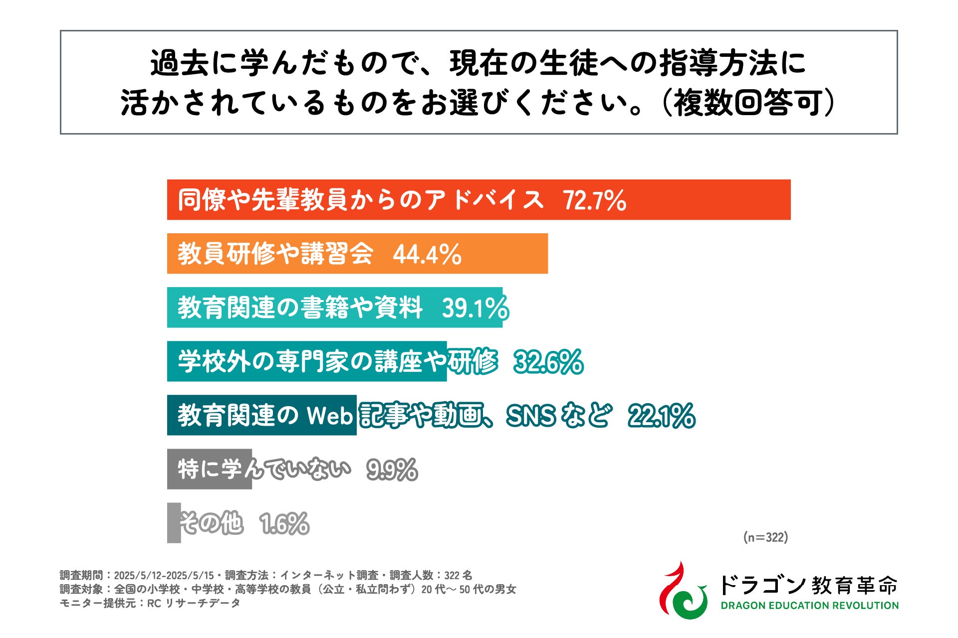 また、「過去に学んだもので、現在の生徒への指導方法に活かされているもの」を尋ねる設問への回答では、1位が「同僚や先輩教員からのアドバイス」で72.7%、2位が「教員研修や講習会」で44.4%、3位が「教育関連の書籍や資料」で39.1%という結果になりました。この結果から、「同僚や先輩教員からのアドバイス」が現在への生徒への指導方法に活かされていると感じている人が多いことが判明しました。
