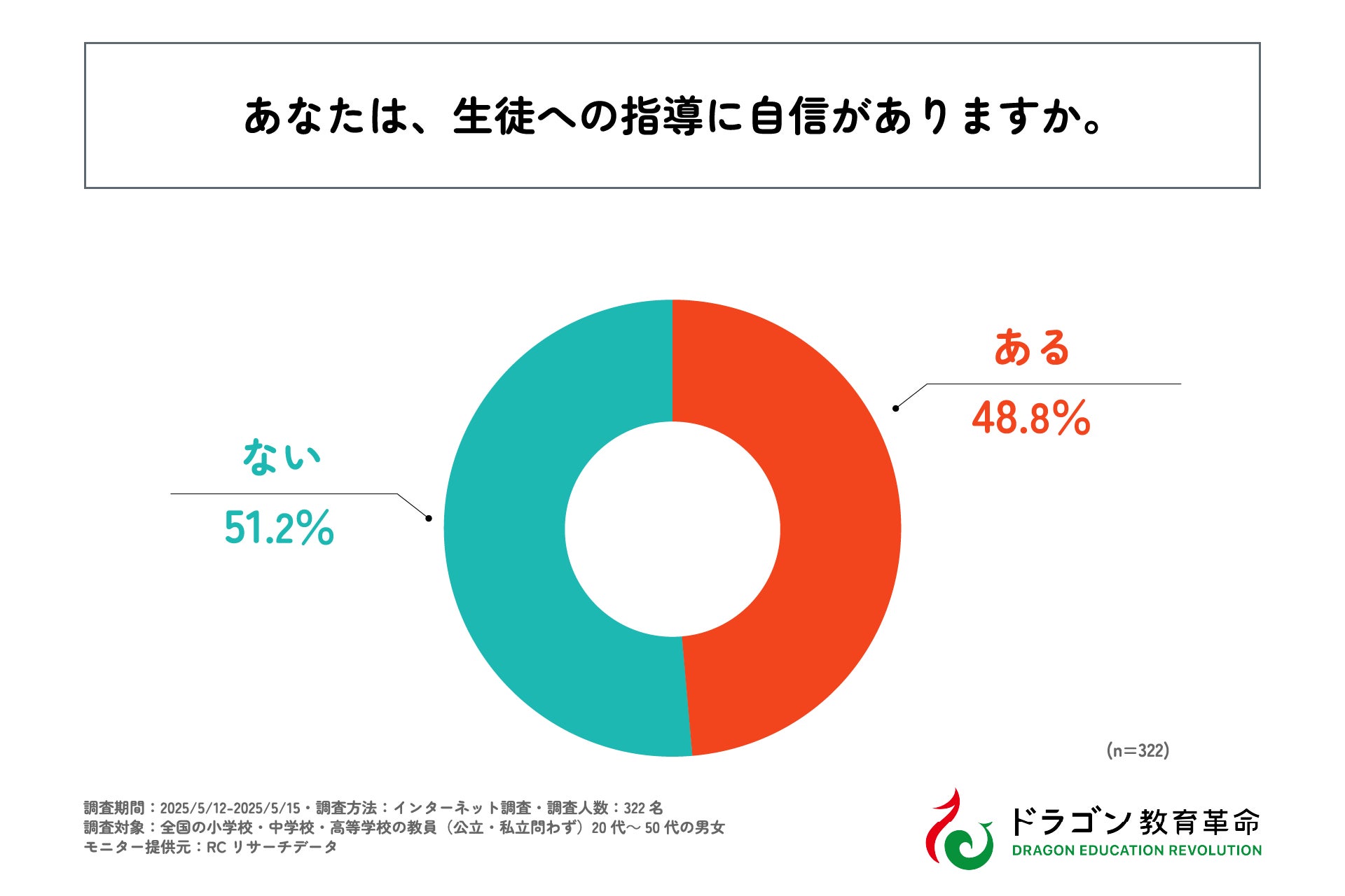 まず、「生徒への指導に自信があるか」を尋ねる設問の回答では、「ない」が51.2%、「ある」が48.8%という結果になりました。この結果から、教員として教育機関で働く人の半数以上が生徒への指導に自信がないことが明らかになりました。