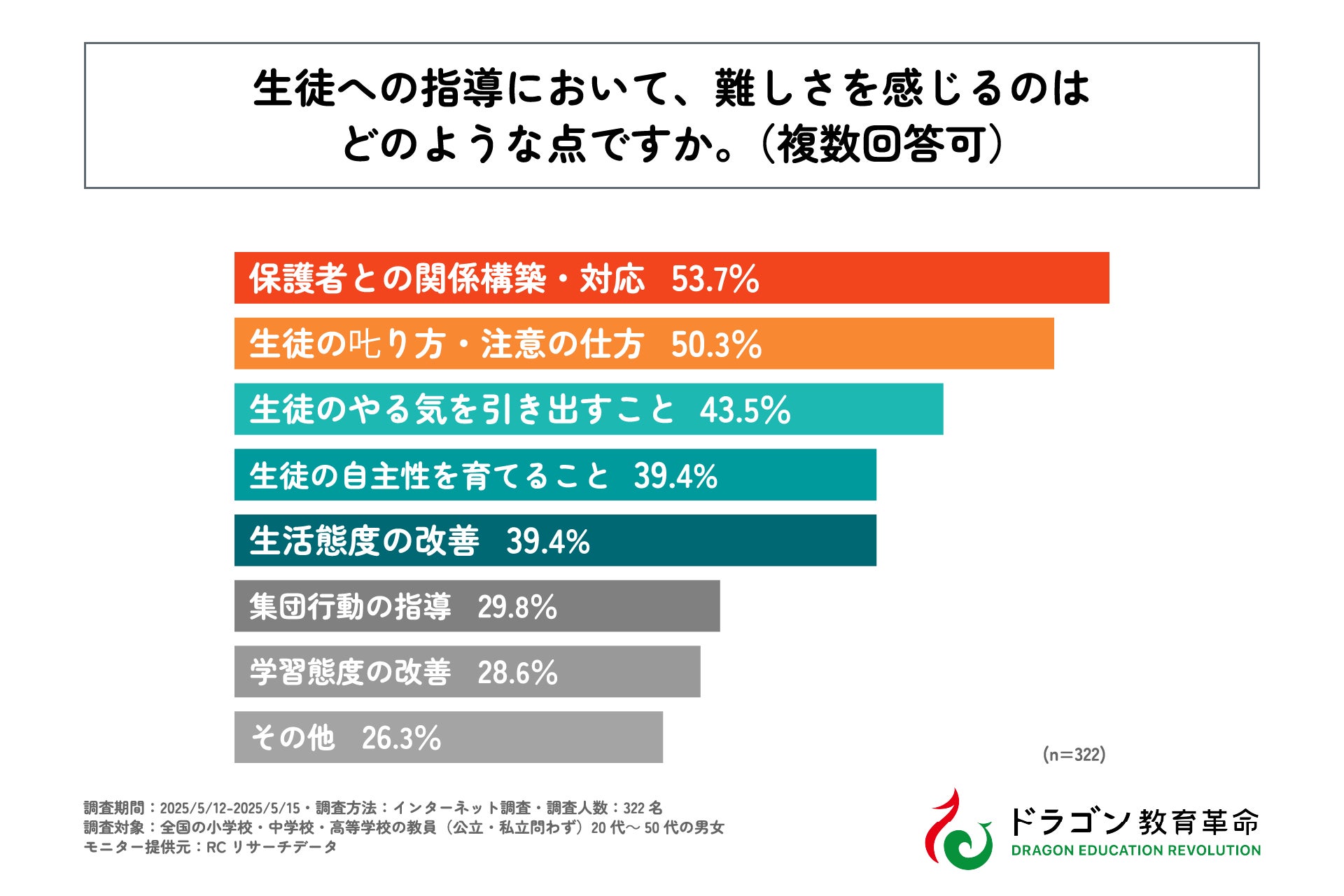 ・生徒への指導において、難しさを感じる点のトップ3は、1位「保護者との関係構築・対応」、2位「生徒の叱り方・注意の仕方」、3位「生徒のやる気を引き出すこと」