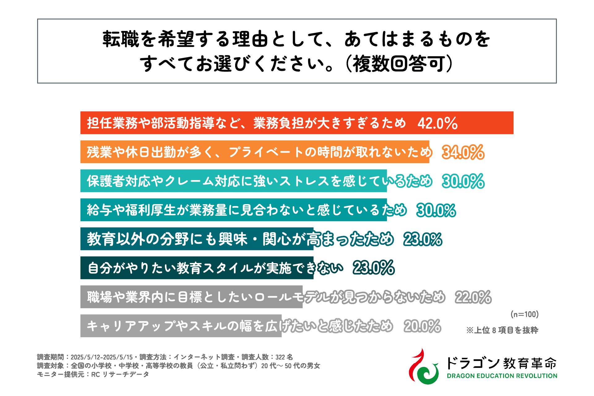 教員のキャリア「転職したい」が3割以上。転職希望理由の第1位は「担任業務や部活動指導など、業務負担が大きすぎるため」!株式会社ドラゴン教育革命が「教員の生徒指導実態とキャリア観」に関する調査を実施!