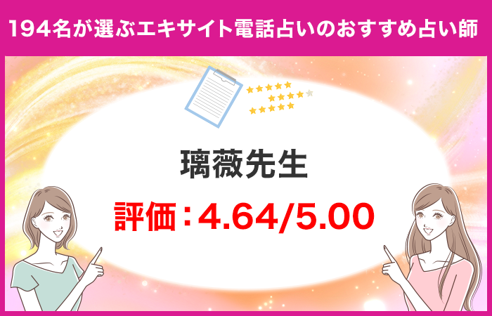 194名の独自アンケートの結果、ユーザーが選ぶエキサイト電話占いでおすすめの先生第1位は「璃薇先生」となりました。満足度評価「4.64/5.00」とユーザーからの評価が高く、『璃薇先生』の占い師の実力が高いことを証明していると言えるでしょう。