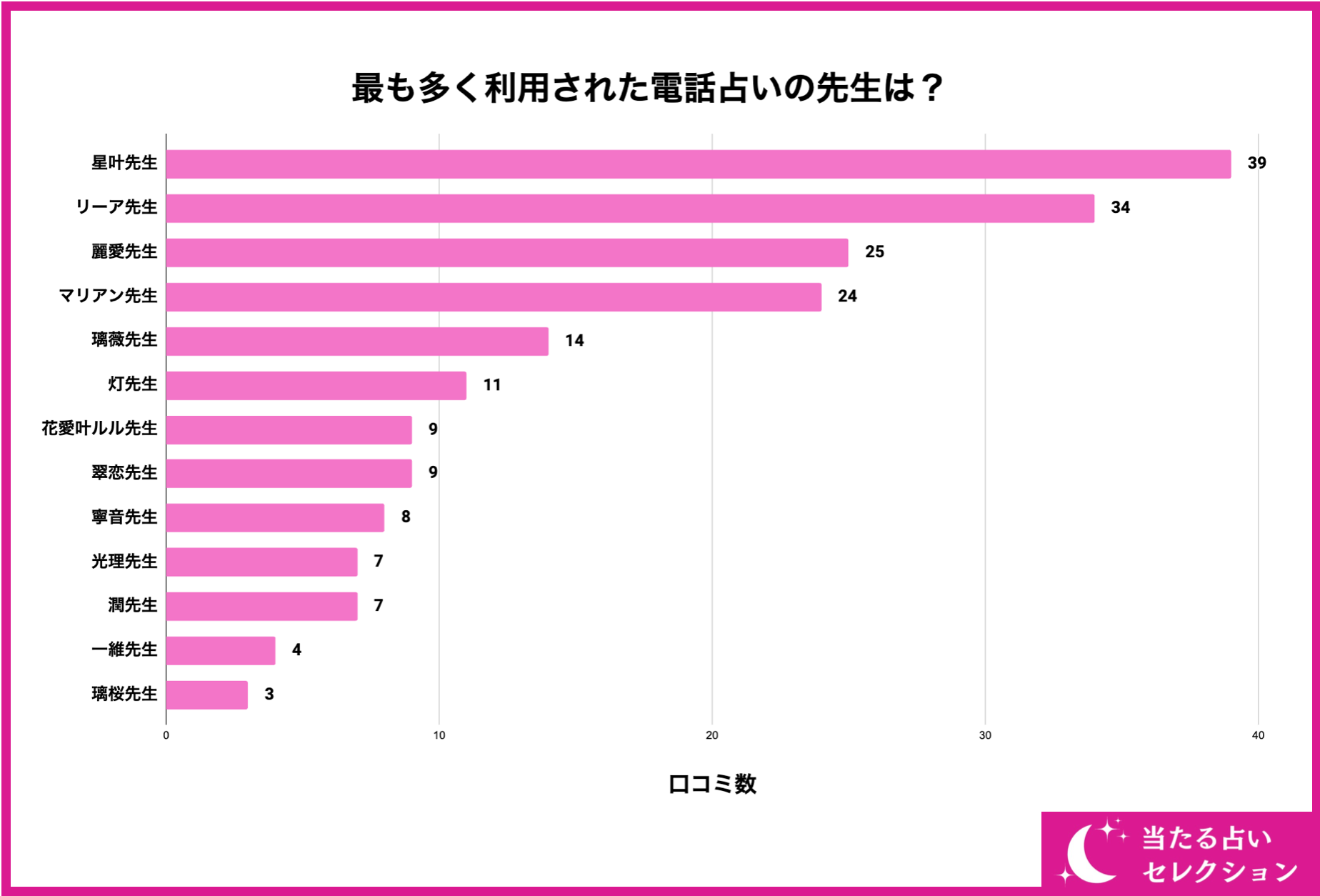 続いて、194名の利用者のうち最も多く利用されたエキサイト電話占いの先生をご紹介していきます。結論から言うと、『星叶先生』や『リーア先生』、『麗愛先生』といった有名な先生が上位となりました。やはり人気の先生は色々な記事や特集で見ることも多く、認知度や知名度が高いため利用者数も多くなっています。さらに、口コミに関しても高評価が多いため、そこからさらにお客さんが集まってくるサイクルになっていると考えられます。