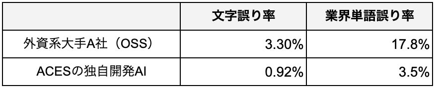 このたび、「ACES Meet」において、人材紹介・派遣業界でトップシェアを誇る基幹系クラウド「CAREERPLUS」「MatchinGood」を開発・提供するブレイン・ラボの監修のもと、人材業界に特化した訓練データを追加し、業界固有の単語に対応する音声認識アルゴリズムの精度改善を実施しました。その結果、外資系大手企業が提供する最新モデルを上回る性能を実現し、人材業界におけるより正確で効率的な情報共有を可能にしました。