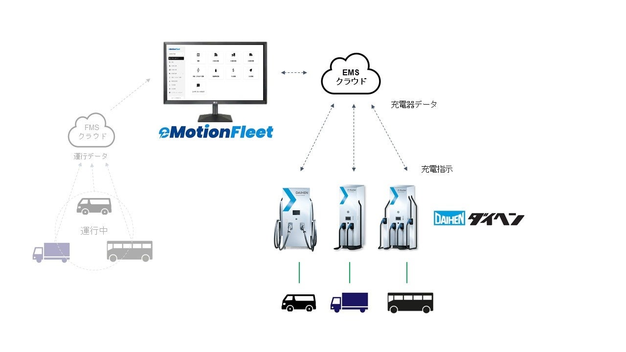 商用EV導入のワンストップサービスを手がけるeMotion Fleet株式会社(本社:東京都新宿区、代表取締役:白木秀司、デニス・イリッチ、以下「eMotion Fleet」)は、株式会社ダイヘン(本社:大阪府大阪市、代表取締役社長:蓑毛正一郎、以下「ダイヘン」)が提供するEV用急速充電器と、eMotion Fleetの「EV運行・エネルギー管理システム(以下「FMS/EMS」)」との連携検証を完了いたしました。