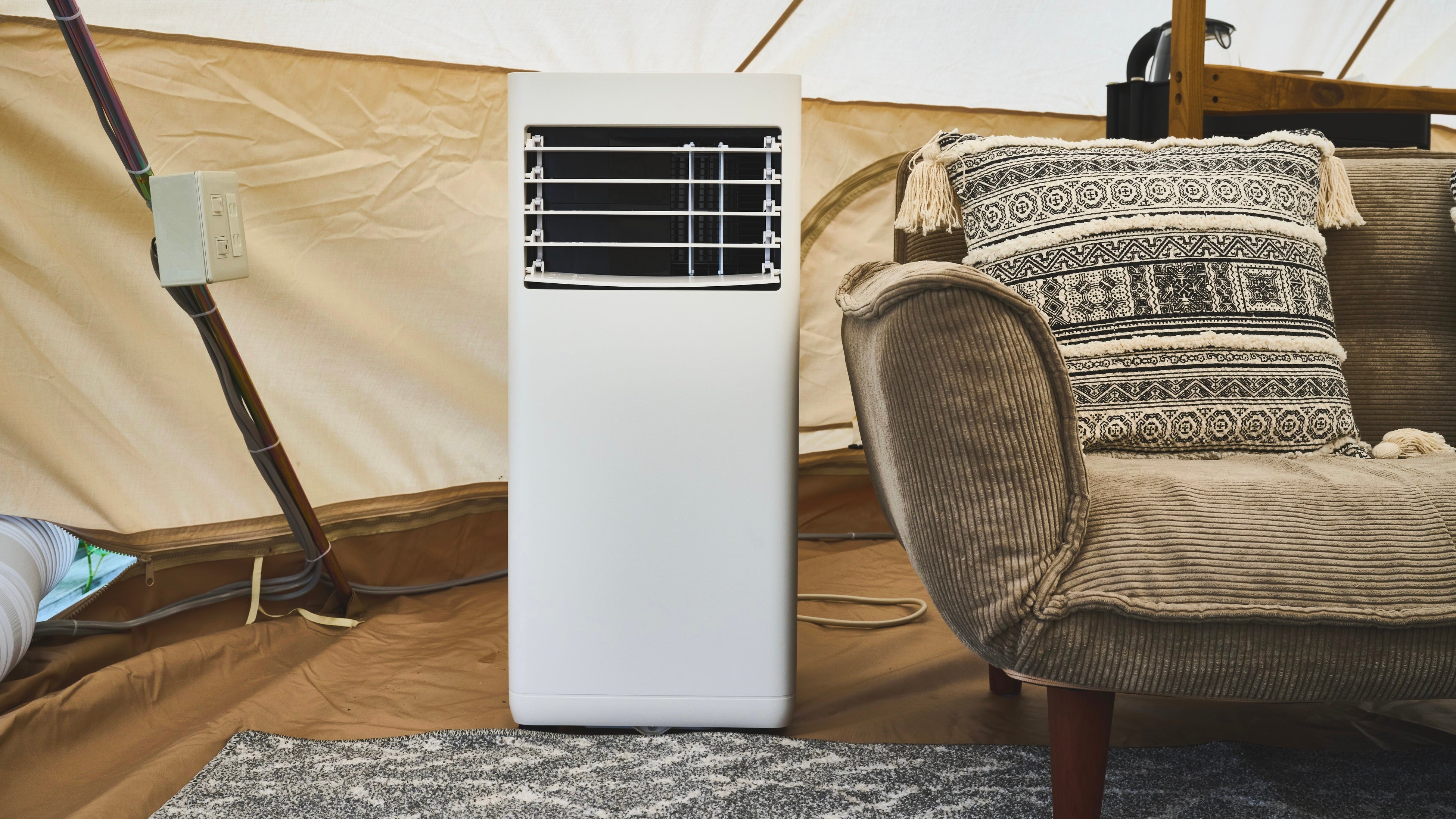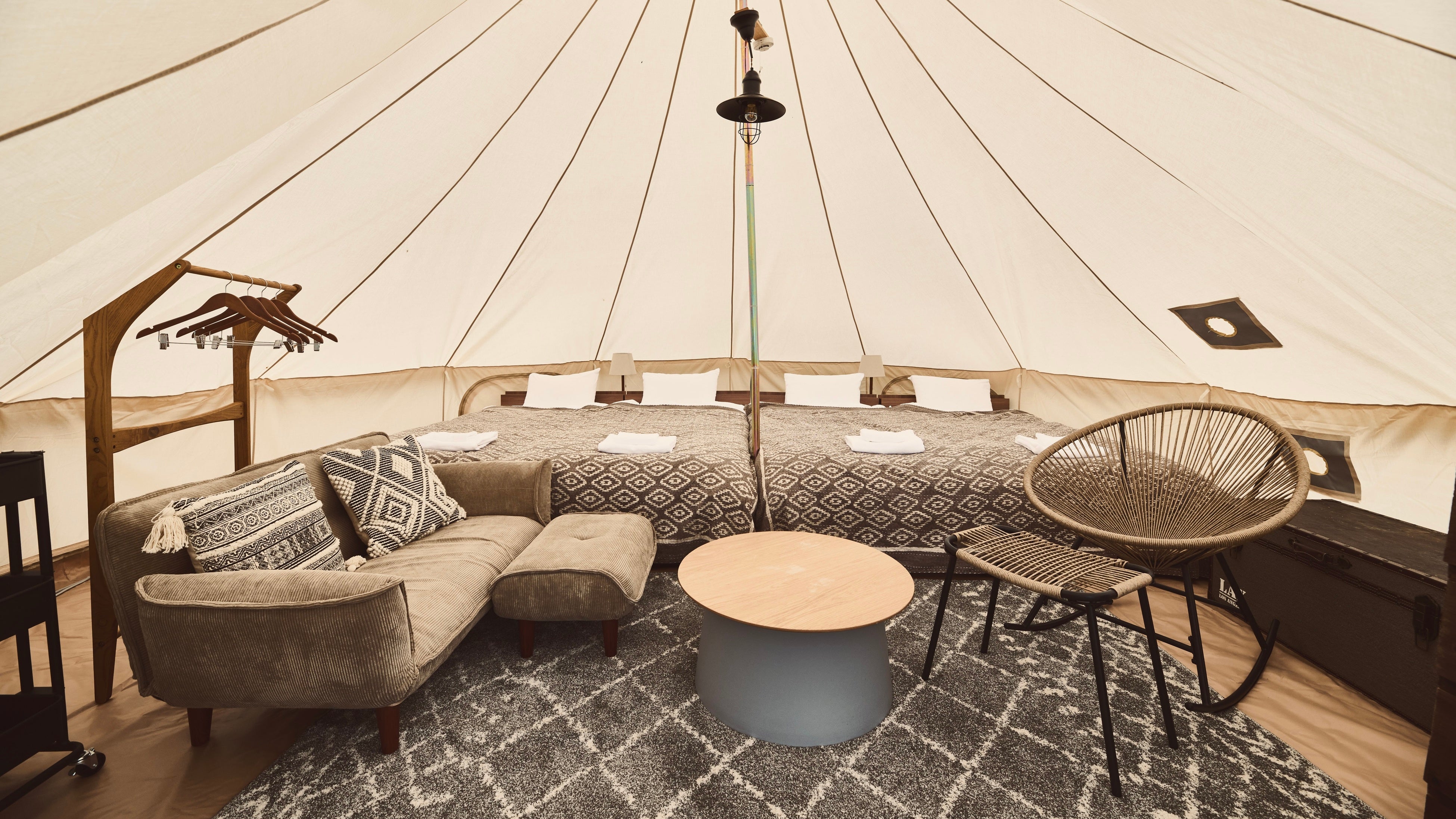 アウトドアテーブル、椅子4脚、シングルベッド4台、テント内テーブル、ソファ、ロッキングチェア、電気コンセント2口、スポットクーラー、ハンガーラック、靴箱、BBQセット、電気ケトル、鏡