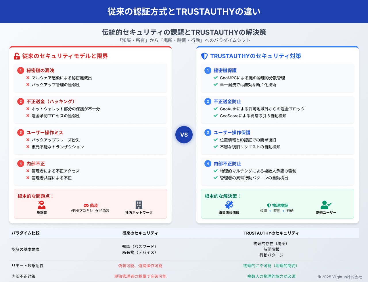 こうした事態を受け、署名者の存在・状況・行動を条件に、秘密鍵の“使用”そのものを制御するゼロトラスト型暗号基盤が、業界の喫緊の課題となっています。GeoAuth/GeoMPC は、衛星即位情報と端末内 TEE(Trusted Execution Environment)署名を組み合わせ、まさにこの「物理的な所在」を改ざん不能に証明することで、リモート攻撃も内部犯行も根本からシャットアウトします。