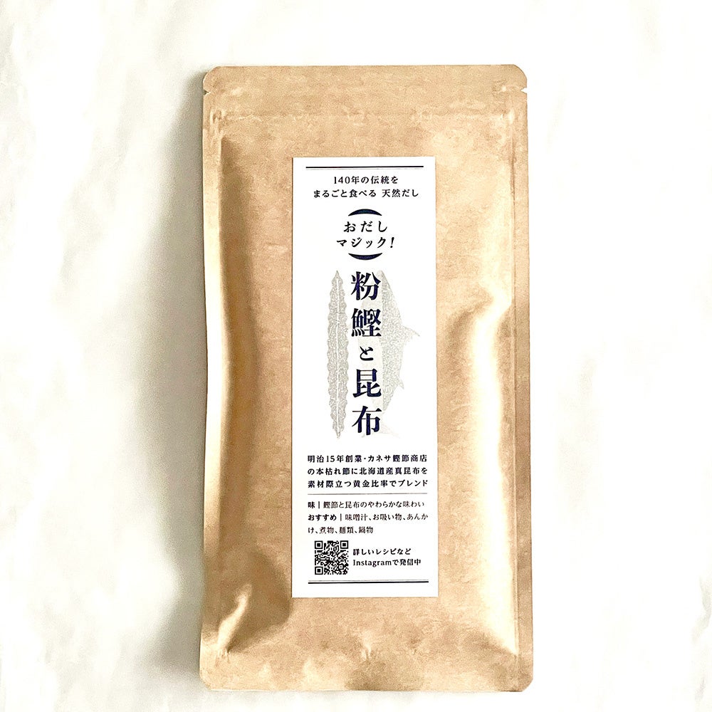 食の世界遺産に認定された、伊豆手火山式焙乾製法の伊豆田子節本枯節と北海道産天然真昆布粉を使用。細かい粉末状に加工、お湯を注ぐだけで簡単に香り高い天然だしが味わえるだけでなく、混ぜたりトッピングしたり、あらゆるお料理に使える「魔法の調味料」です。