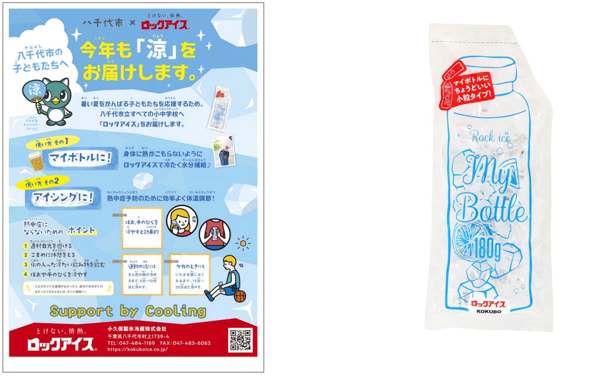 小久保製氷冷蔵株式会社(KOKUBOグループ、千葉県八千代市、代表取締役社長:小久保 龍平、以下小久保製氷冷蔵)は、7月3日より八千代市立の小学校と中学校及び義務教育学校全30校に熱中症対策として「ロックアイス®マイボトル180g」の配布を開始しました。暑さ対策とスポーツアイシングの啓蒙を通して、暑い夏でも勉強とスポーツを頑張る子供たちを応援します。また、7月12日には八千代市立睦中学校で生徒代表者と小久保製氷冷蔵担当者が出席する「贈呈式」が開催されます。