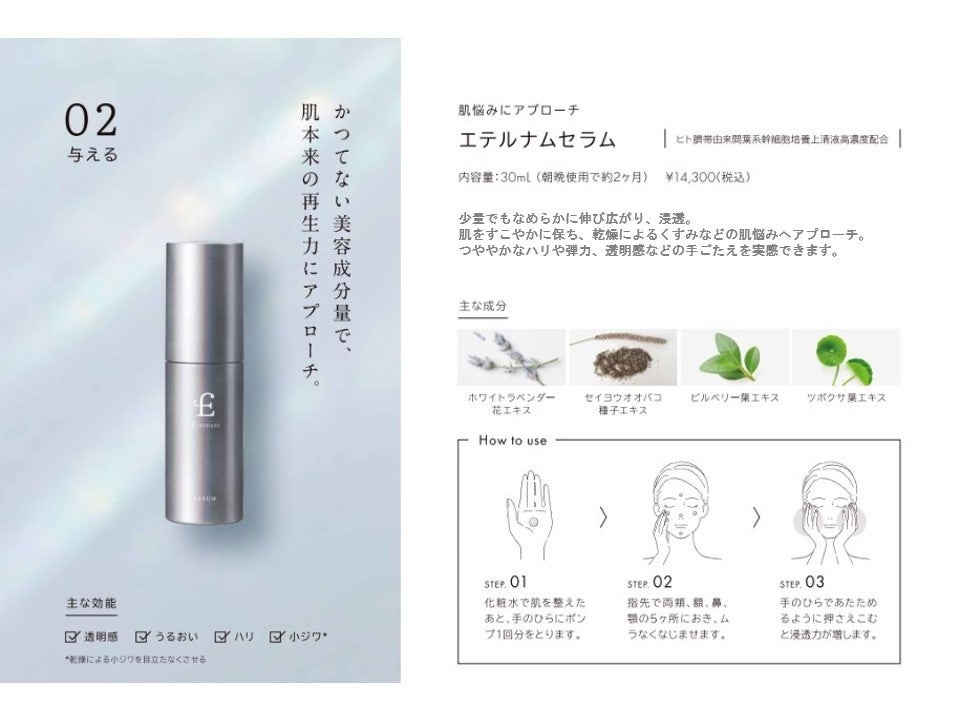 エテルナムの臍帯由来の幹細胞コスメは従来の保湿メインのスキンケアではなく、再生医療の見地から得た新発想のスキンケアで「時のない肌」へ導く、画期的な商品です。