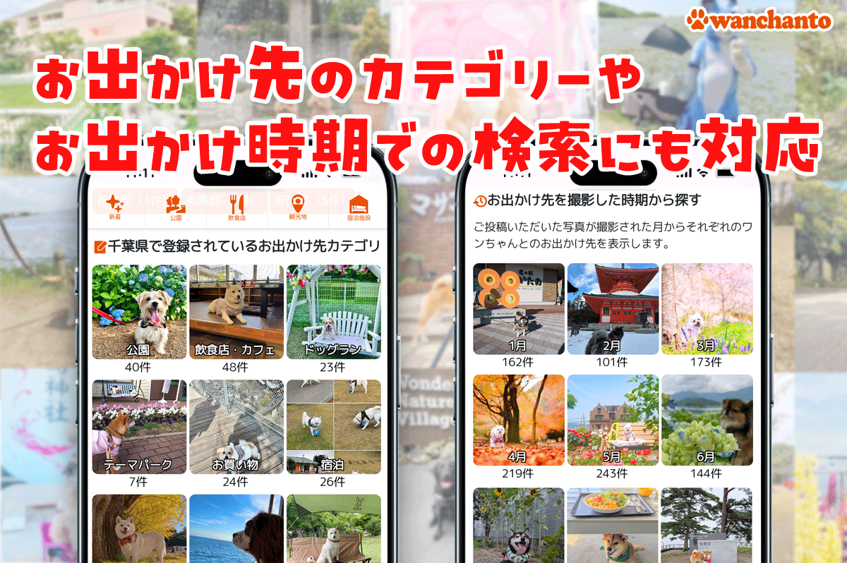 「ワンちゃんと」は、ユーザーの皆様が投稿した口コミで成り立っています。お出かけ先の口コミが増えるほどに、より多くの愛犬家さんとワンちゃんが幸せな時間を過ごせるようになります。ぜひ「ワンちゃんと」を愛犬との素敵な思い出の共有ツールとして使っていただけると幸いです。