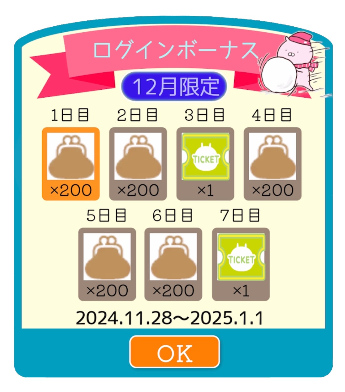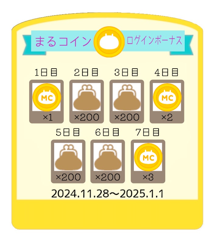 ※期間中は表示されている7日分のログインボーナスを全て獲得すると1日目から再度獲得可能となります