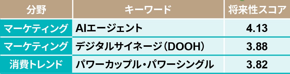 時流を踏まえて今回の調査から新たに追加したキーワードは、マーケティング分野の「AIエージェント」「デジタルサイネージ(DOOH)」、消費トレンド分野の「パワーカップル・パワーシングル」です。分野別スコアランキングは、マーケティング分野のAIエージェントが32キーワード中8位、デジタルサイネージが17位でした。消費トレンド分野のパワーカップル・パワーシングルは、33キーワード中10位でした。