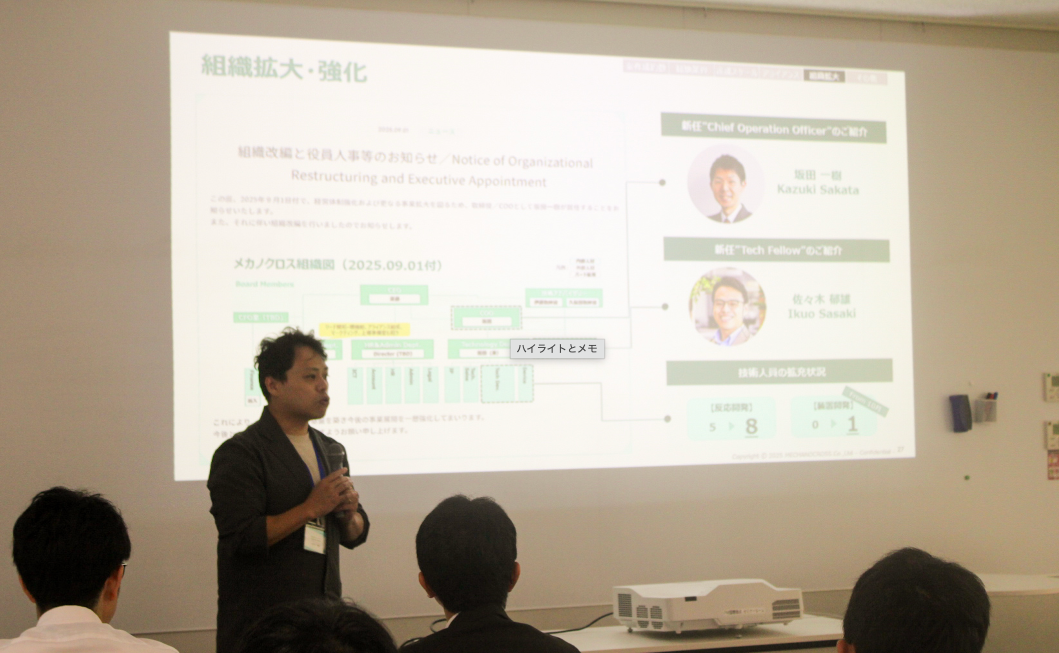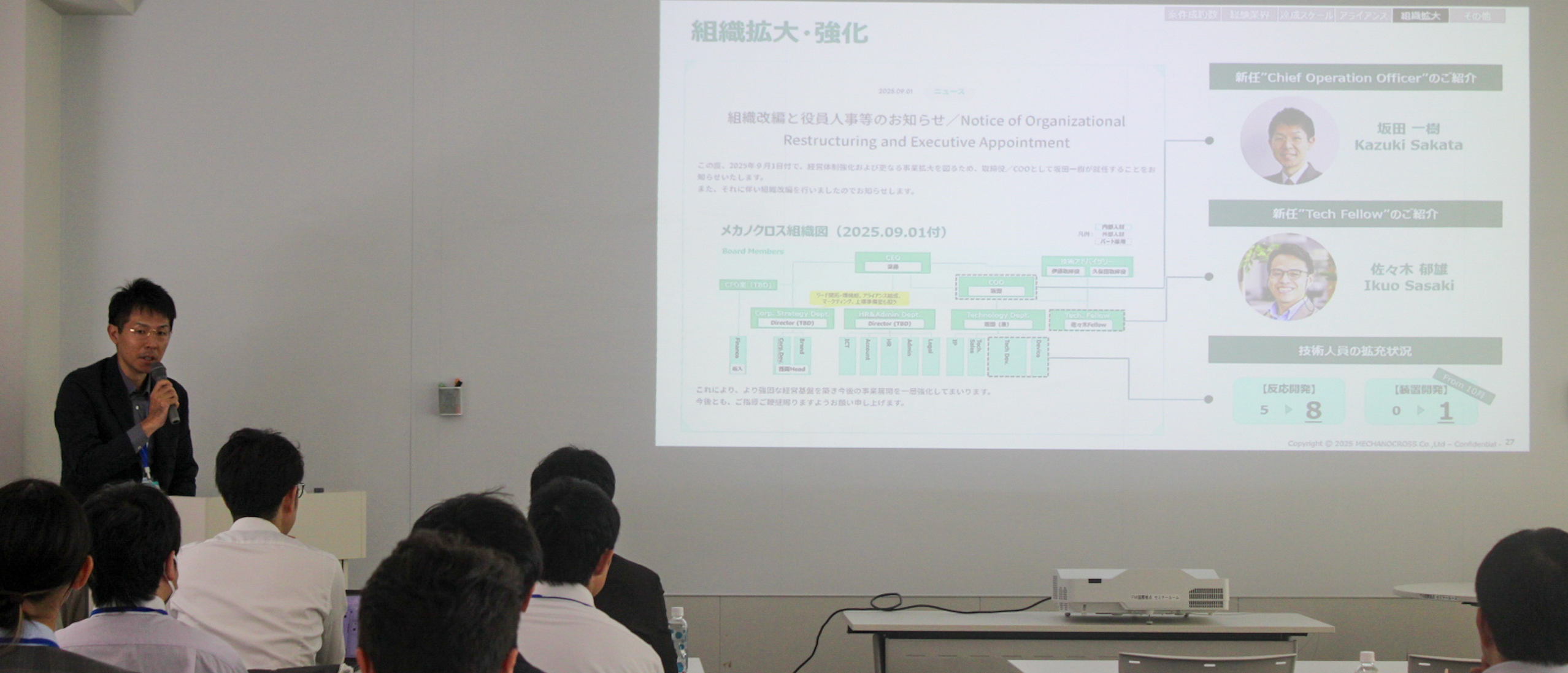 坂田からは、「研究開発・製造・事業推進を一体化し、より多くの企業・産業領域でメカノケミカル技術を実装していく」方針が示され、今後は特に企業との共同開発案件や事業連携に一層注力していくことを表明いたしました。