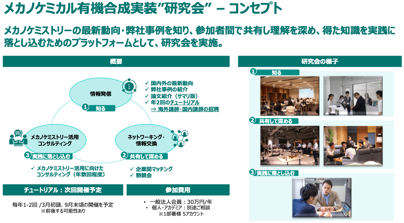 会員企業は17社まで拡大。メカノケミカル有機合成に関する講演資料や論文要約をデータベース化 し、会員サイトで共有。世界の最新研究開発動向を定期的に提供し、知識共有・実践支援の場を形 成。