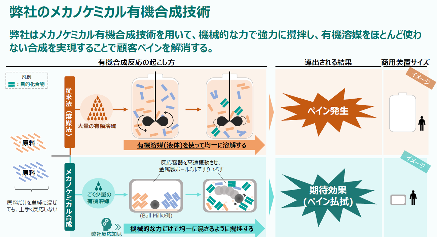 溶液有機合成反応のメカノケミカル化技術の開発・提供不溶性高機能材料の開発・提供上記の製造プロセス導入の実証検証、および、製造装置提供メカノケミカル有機合成関連情報発信