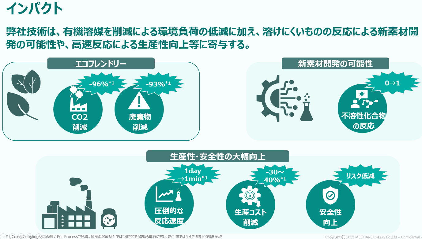 本技術は、有機溶媒をほとんど使用せずに有機合成を行えるため、脱炭素対策やコスト削減の面で従来プロセスより優位性を持ち、高い反応性と環境適応性を兼ね備えています。また、溶媒を使用しないことにより、従来は合成が難しかった不溶性・難溶性化合物にも対応でき、半導体・ディスプレイ・電池材料など先進素材の性能向上にも貢献が期待されます。