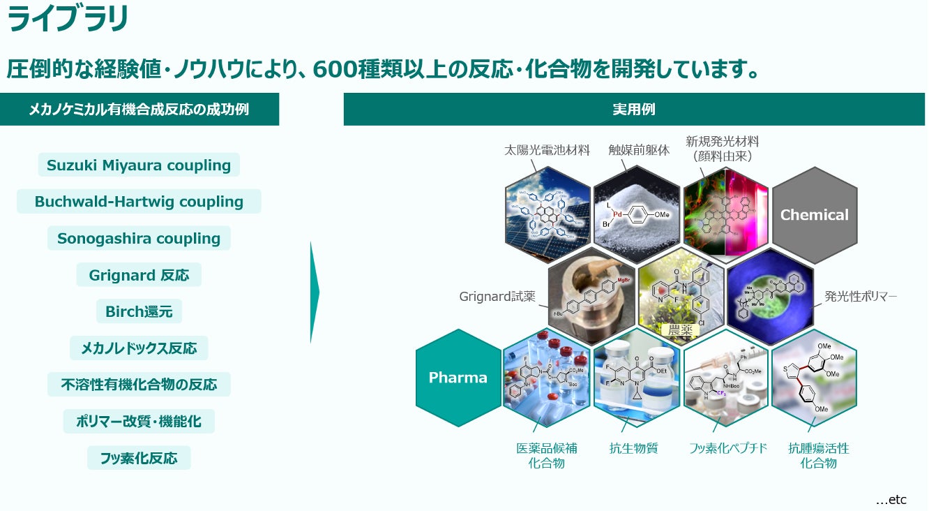 さらに、本技術は幅広い有機合成反応に適用でき、北海道大学工学研究院・伊藤研究室(伊藤肇教授〈弊社取締役〉)を中心に、多様な反応系での実証が進められてきました。これまでに数百件に及ぶ反応・化合物の合成実績があり、特に今回の協業で焦点を当てる不溶性/難溶性化合物の合成では、豊富な知見と成果(メカノケミカルライブラリー)を有しています。