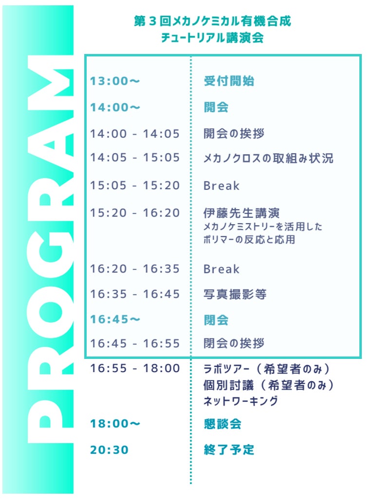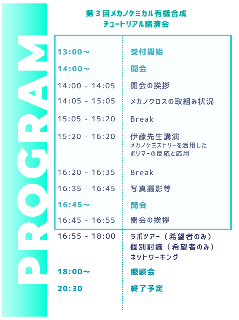 本チュートリアルでは、毎回恒例となる弊社の最新技術開発の進捗報告に加え、弊社取締役であり世界的なメカノケミストリー研究の第一人者である北海道大学・伊藤肇教授の特別講演、およびゲスト講師による講演等を実施いたしました。具体的には、研究会会員企業を中心に多数の技術者・研究者の皆さまに現地でご参加いただき、以下プログラムを開催いたしました。