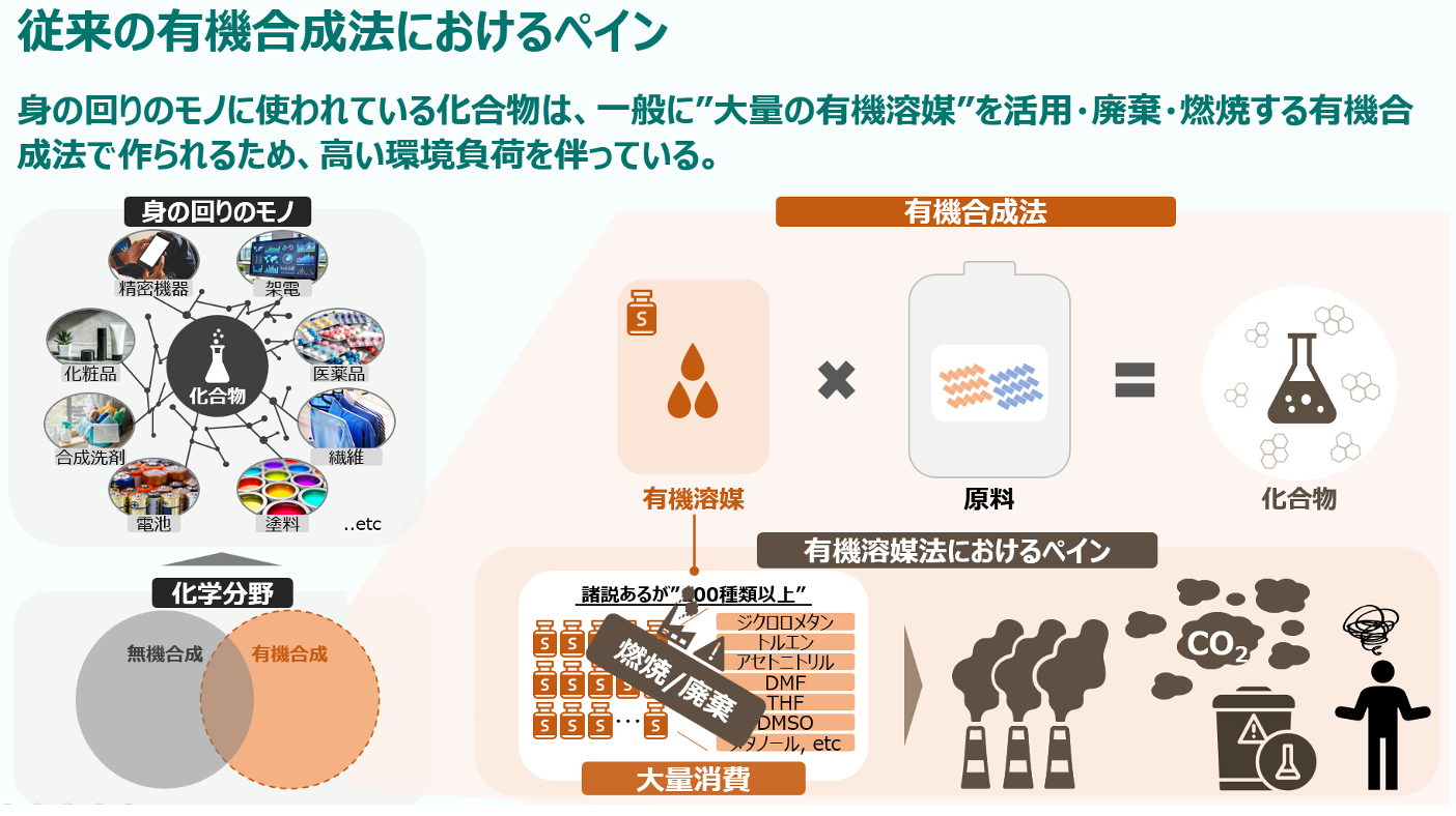 メカノケミカル有機合成は、反応工程に必要な石油由来の有機溶媒を大幅に削減し、環境負荷を軽減できる技術です。従来の有機合成では、原料の100倍以上の溶媒を使う場合もあり、反応後にそれらを燃焼または廃棄処理する必要がありました。