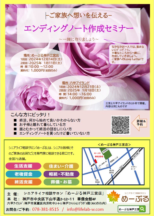 めーぷる神戸三宮店は、2024年12月と2025年1月に「エンディングノート作成講座2回シリーズ」を開催いたします。