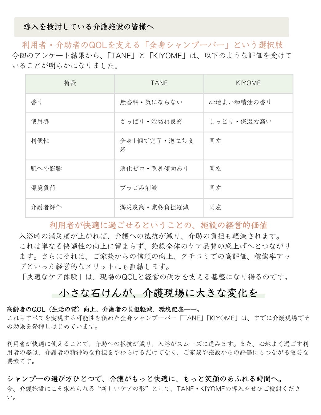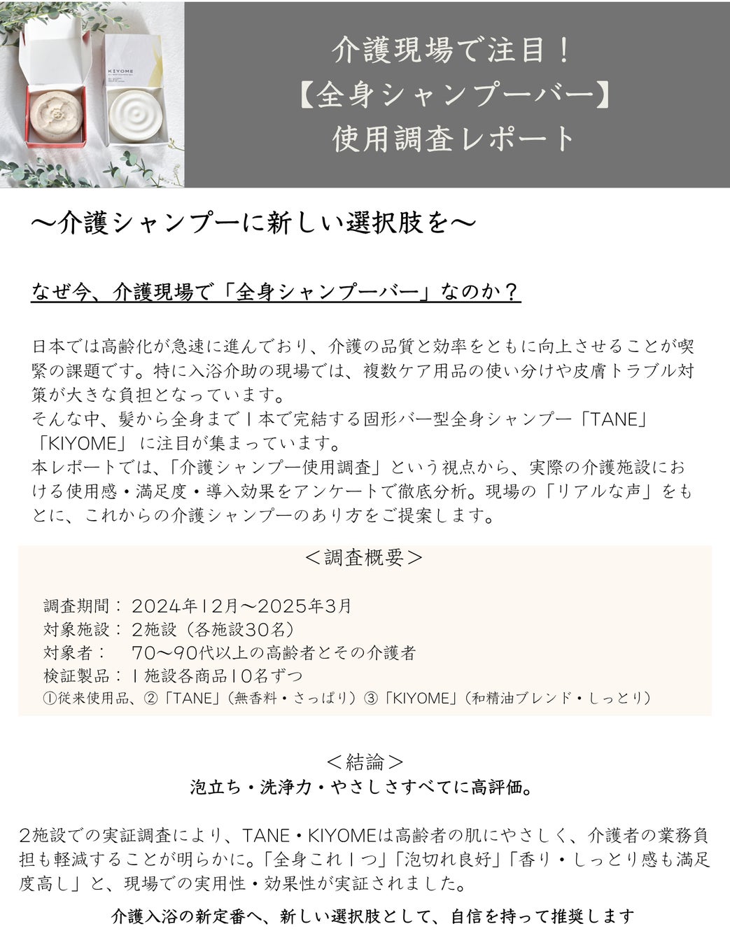日本伝統のアップサイクル素材を活かした革新的なスキンケアを展開するエシカルブランド、株式会社CHANT(本社:東京都港区、代表取締役:谷岡 亜希子)は、介護現場のQOL向上を目指す「LQX(Life Quality Transformation)」の取り組みとして、介護施設で全身シャンプーバー「TANE」「KIYOME」の実証調査を行い、介護負担軽減や利用者の快適性向上に寄与する結果を得ました。