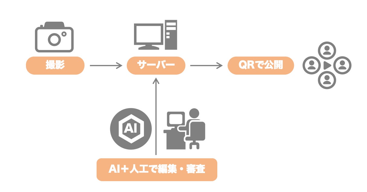 以下は、このサービスの仕組みです。カメラマンは現場で撮影した写真を専用アプリを使って随時サーバーにアップロードします。写真はクラウドサーバーに保存され、AIによって自動的に色調整や被写体の認識と分類が行われます。その後、プロの写真編集者が自動編集された写真を微調整し、一般公開します。審査が不要な場合は、自動的に公開されます。