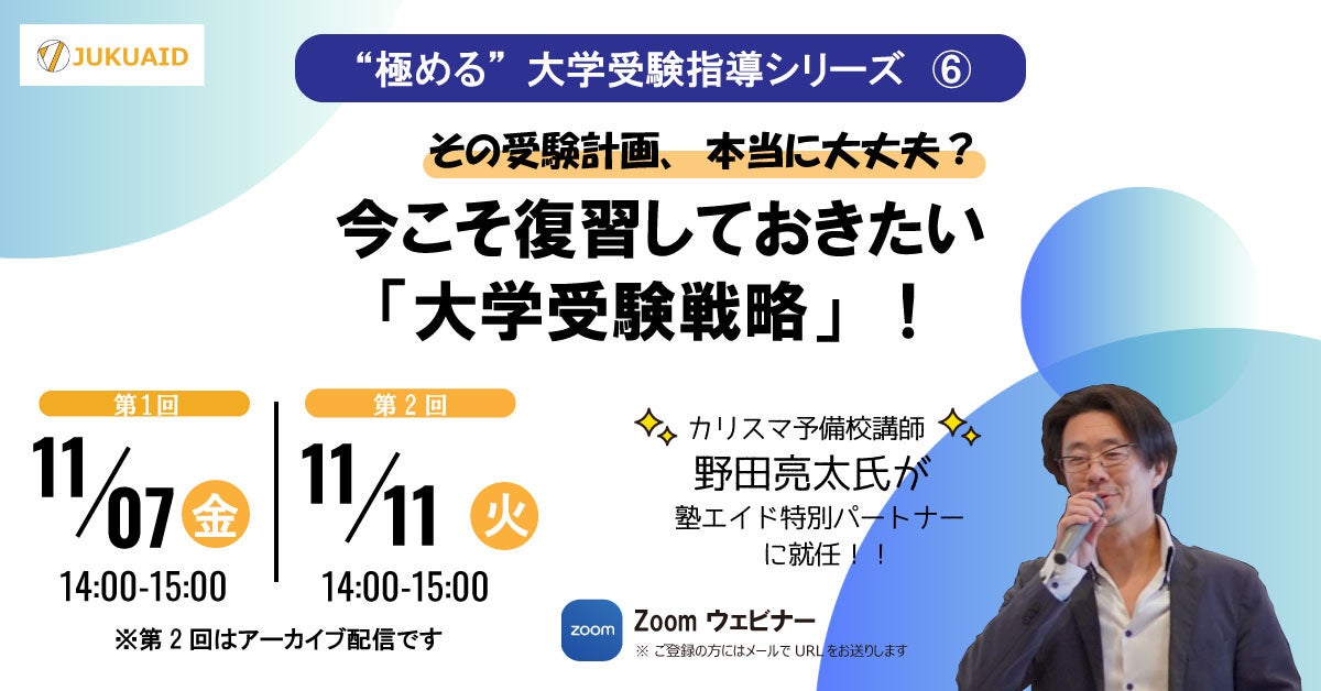塾エイド特別パートナーの野田亮太氏の大人気シリーズセミナー、「“極める”大学受験指導」です。大学受験のプロである野田先生に、今日から実践できる内容をお話しいただきました。