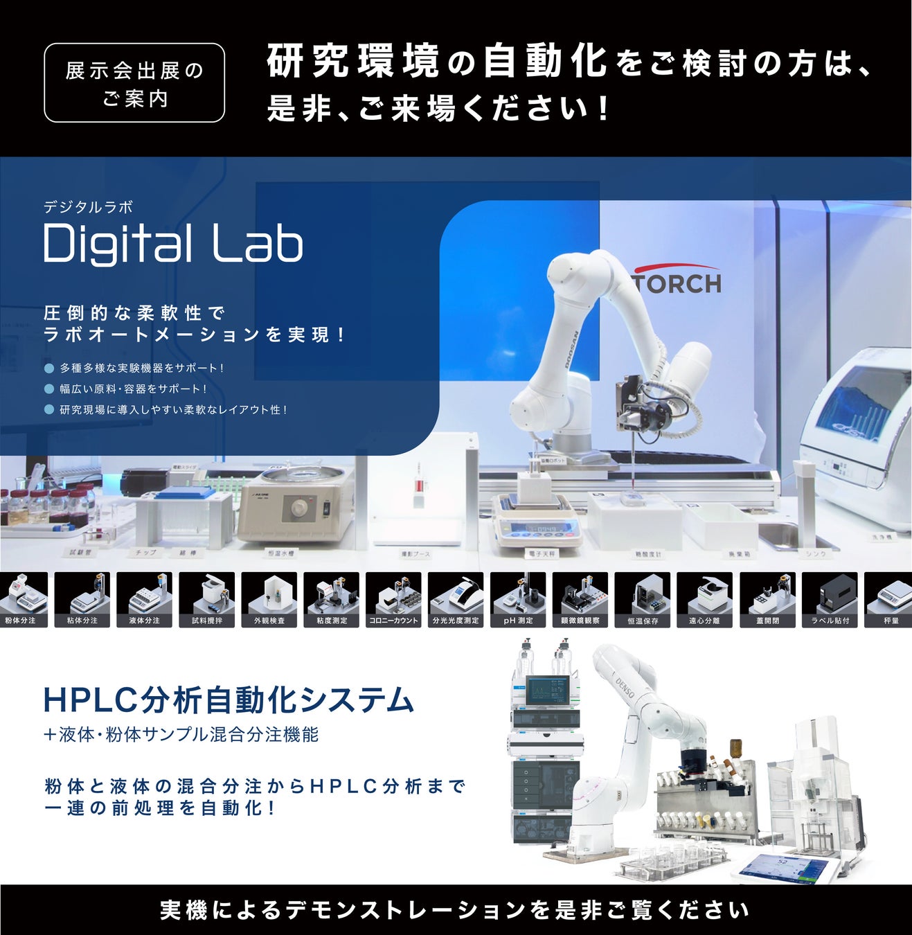トーチ株式会社(本社:東京都江東区/代表取締役社長:石澤祐介)は、協働ロボットを活用した研究開発を自動化するラボオートメーションシステムである「デジタルラボ」および「自動粉体・液体混合分注&HPLC分析システム」を、インターフェックスWeek東京ファーマラボEXPOに出展いたします。