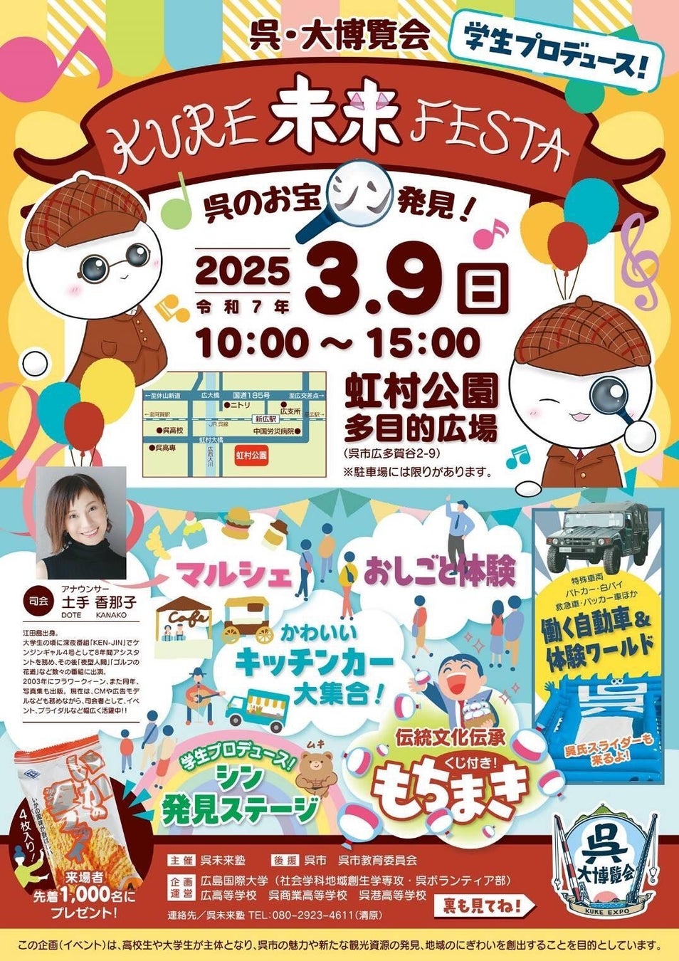 高校生による楽しい企画や、お仕事体験、ワークショップなど多彩なイベントが盛りだくさんです!その他にも呉を代表するグルメやキッチンカーも出店いたします。是非ご家族そろってご来場ください。