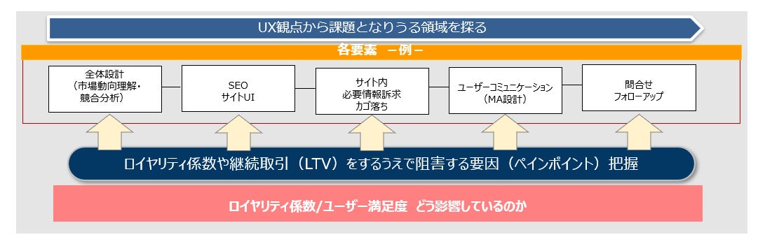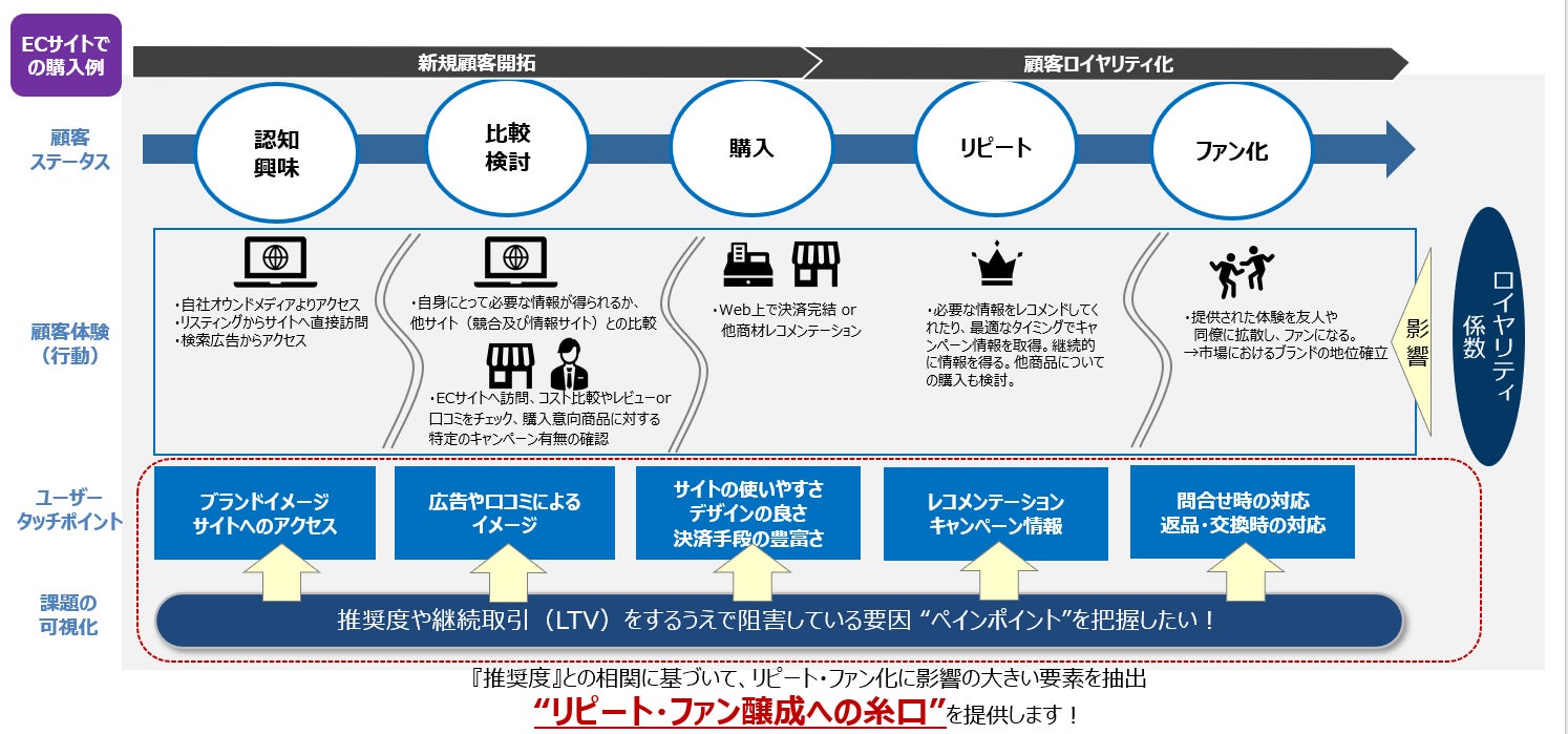そのような背景から、まずは「顧客の行動と接点においてどこに課題があるのか」「どの接点がロイヤリティ向上の妨げになっているのか」(※図1)を可視化するサービスが必要であると当社は考えました。この度、当社はこの「顧客行動と接点における課題の可視化」という重要課題を解決するためのリサーチメニューとして「CXサーベイプログラムby Allonz」をリリース致します。