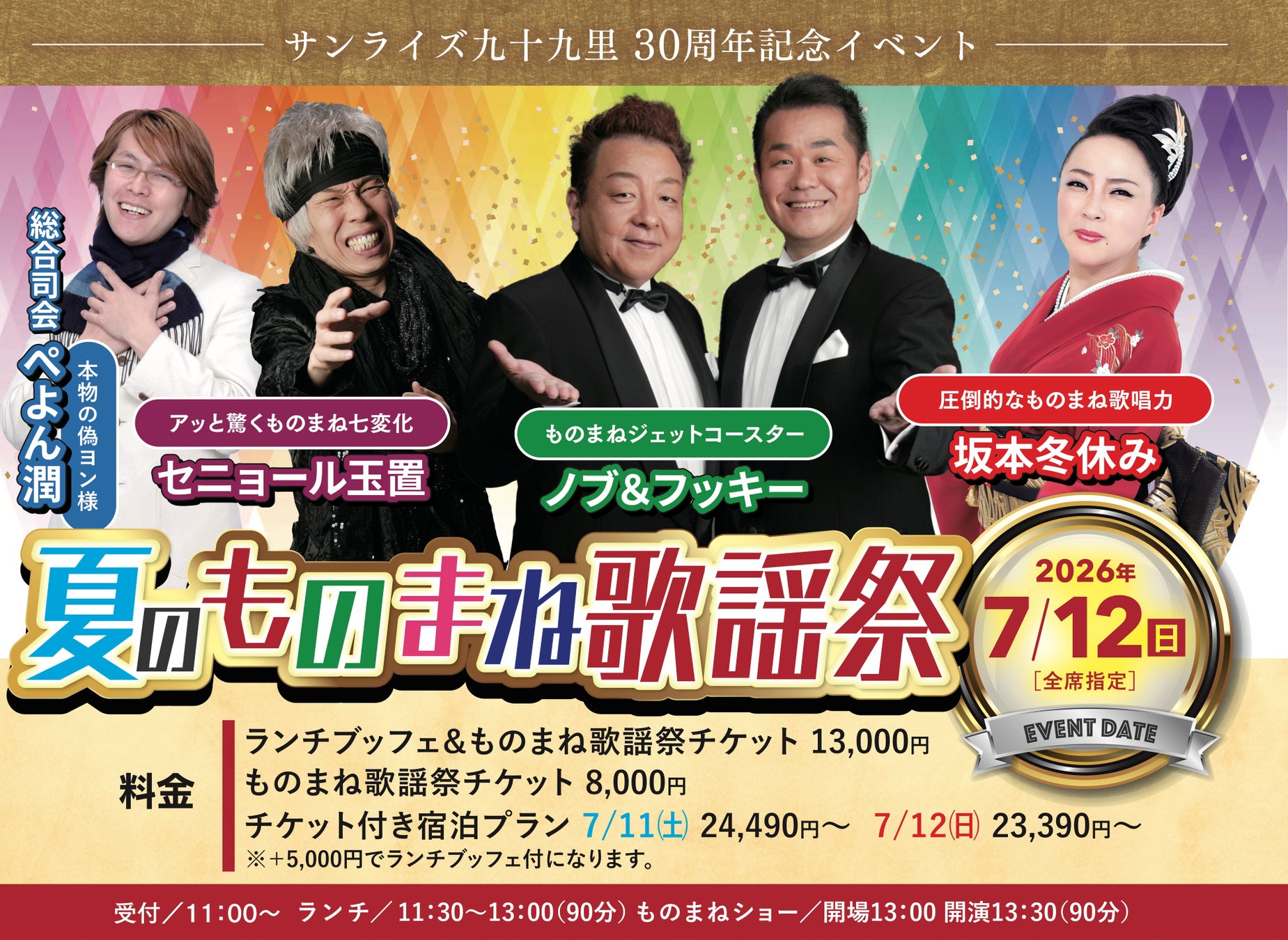 サンライズ九十九里30周年記念イベントとして、2026年7月12日(日)に夏のものまね歌謡祭を開催いたします。ものまねジェットコースター「ノブ&フッキー」、圧倒的なものまね歌唱力「坂本冬休み」、アッと驚くものまね七変化「セニョール玉置」、総合司会に本物の偽ヨン様「ぺよん潤」と豪華なラインナップのものまねタレントが出演いたします。シェフが腕を振るうサンライズランチブッフェと笑いが絶えない魅力溢れるステージをご堪能いただき、心に残る楽しいひとときをお過ごしいただけます。また、ショー終了後にサンライズ九十九里ペア宿泊券や千葉県の特産品などが当たる抽選会も開催いたします。