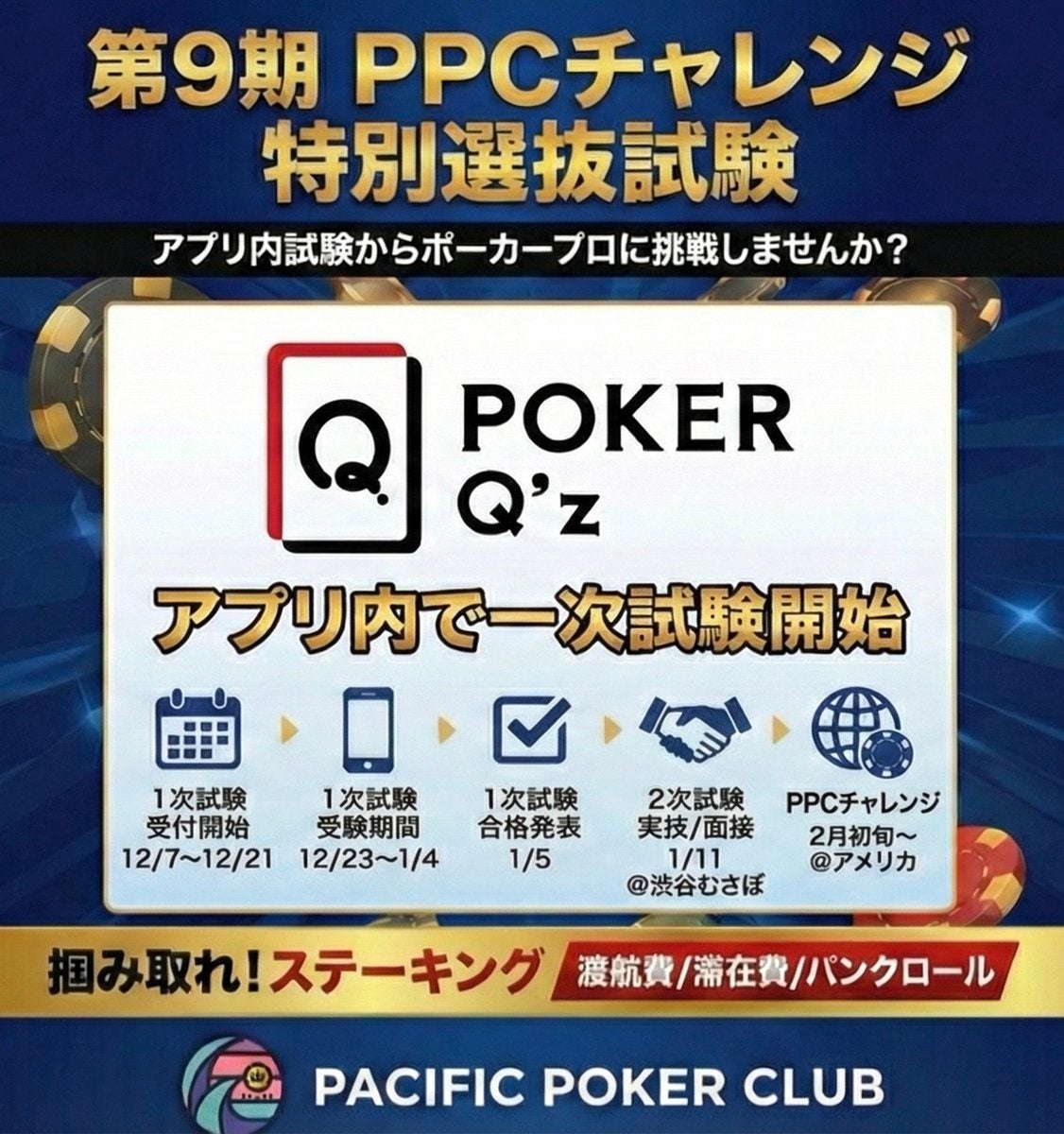 ポーカー理論の研究と学習アプリの開発を行うCLOViZ株式会社(本社:東京都世田谷区、代表取締役:真崎颯太郎)は、ポーカー学習アプリ「POKER Q'z(ポーカーキューズ)」において、全国でポーカーアミューズメント施設を展開する株式会社MUSASHI Entertainment(所在地:東京都新宿区、代表取締役:須佐亮太)に対し、「海外遠征プログラム選考」における一次試験のオンライン受験機能を提供開始しました。