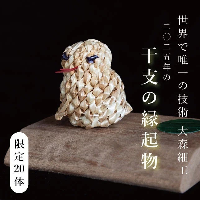 日本の伝統文化を次世代に伝える活動を展開する粋響株式会社(所在地:静岡県富士宮市 代表:佐野 翔平)は、自社運営の通販サイト「伝統屋 暁」から、江戸時代からの伝統「大森細工」による干支の縁起物を限定20体、2024年11月28日までの期間限定での販売を開始いたしました。本作品は、麦を育てるところから大森細工による作品づくりまでを手がけている静岡県伊豆市修善寺「民藝麦わらの店 晨(あした)」製作のもので、2025年の干支である「み」を表現しています。