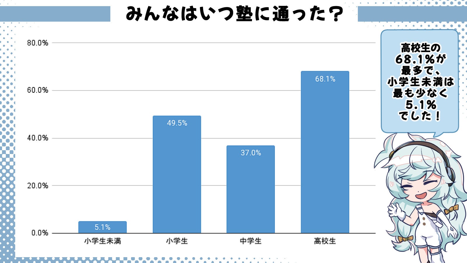また、小学生未満で塾に通っていた人の割合が一番少なく、5.1%であったことから、小学校受験をするために塾に通う人は想像より少ないことがわかりました!
