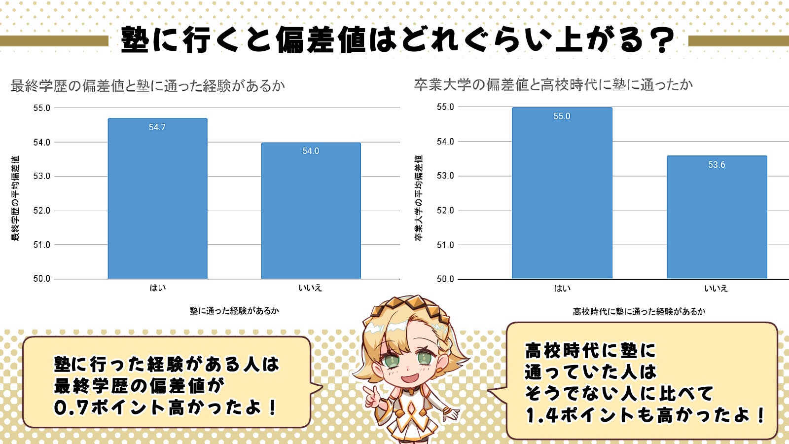 結果としては、通塾経験が一度でもある人の平均偏差値は54.7、一度もない人の平均偏差値は54.0で、塾に行った経験がある人は最終学歴の偏差値が0.7ポイント高いことがわかりました。