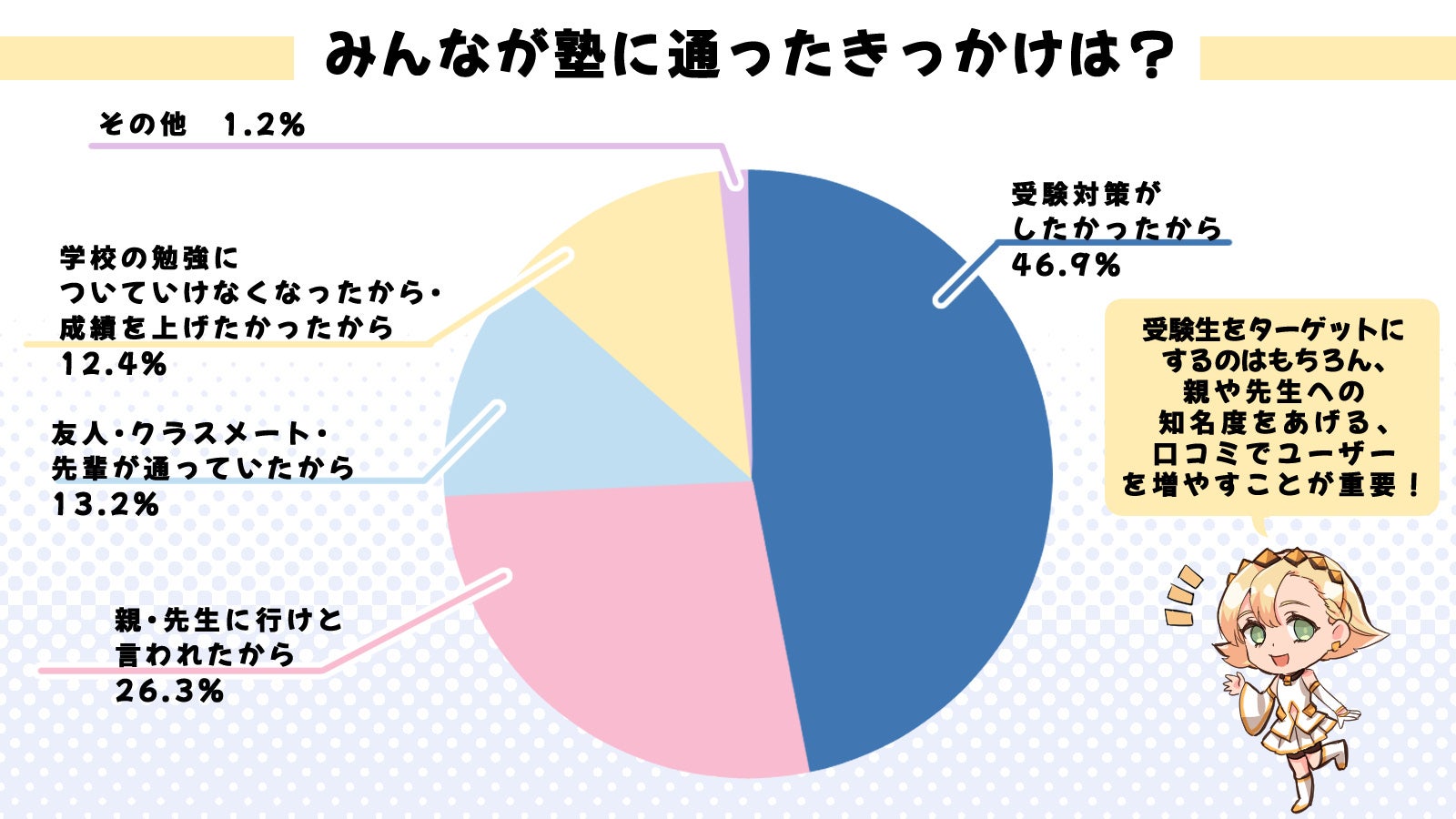 みんなが塾に通い始めたきっかけで一番多かったのは受験対策のためでなんと46.9%と約半分を占めます!