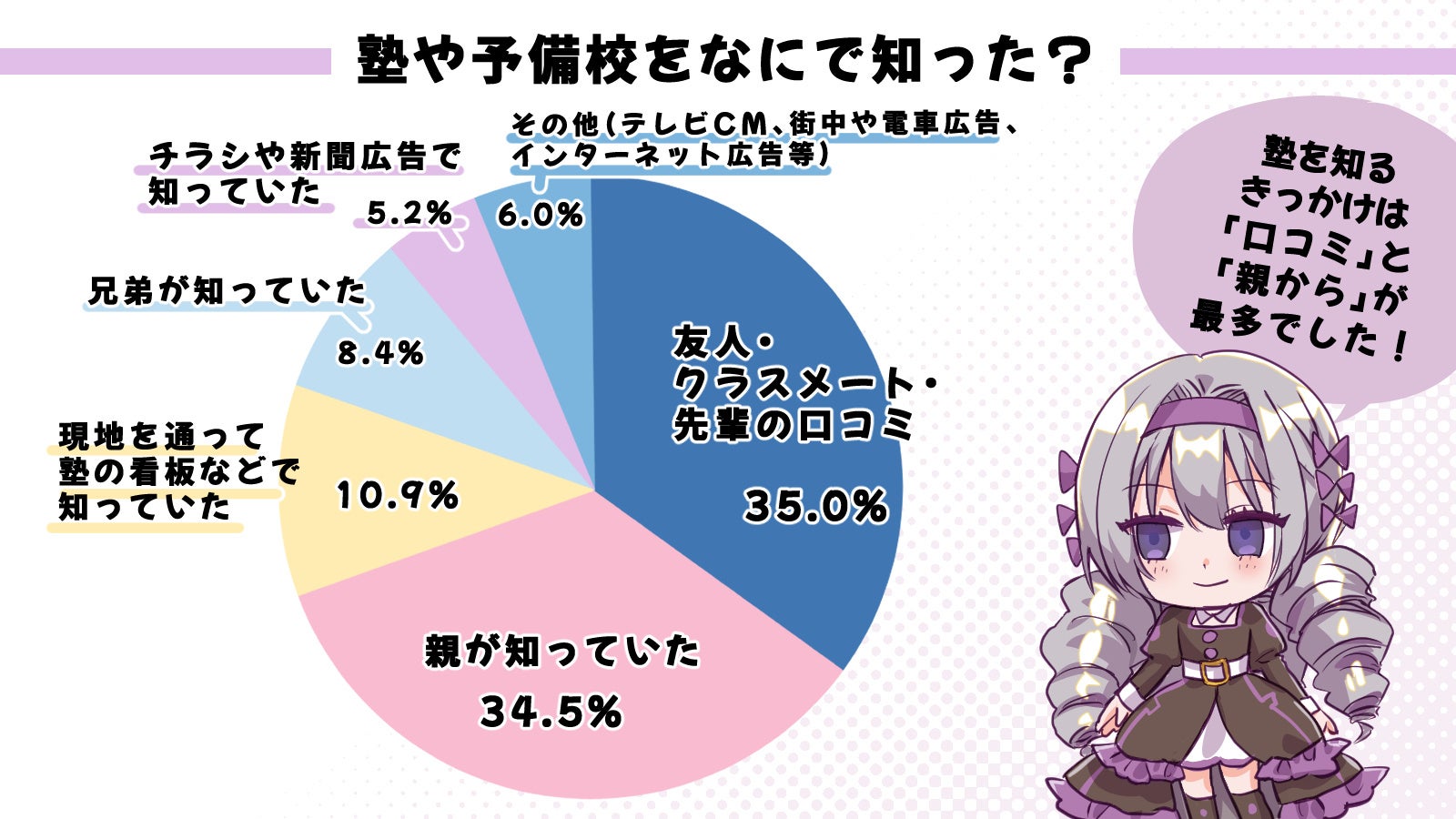 さらに、学校の勉強についていけない、学校の成績を上げるために入塾を決める人は12.4%と意外に少ない事もわかりました。