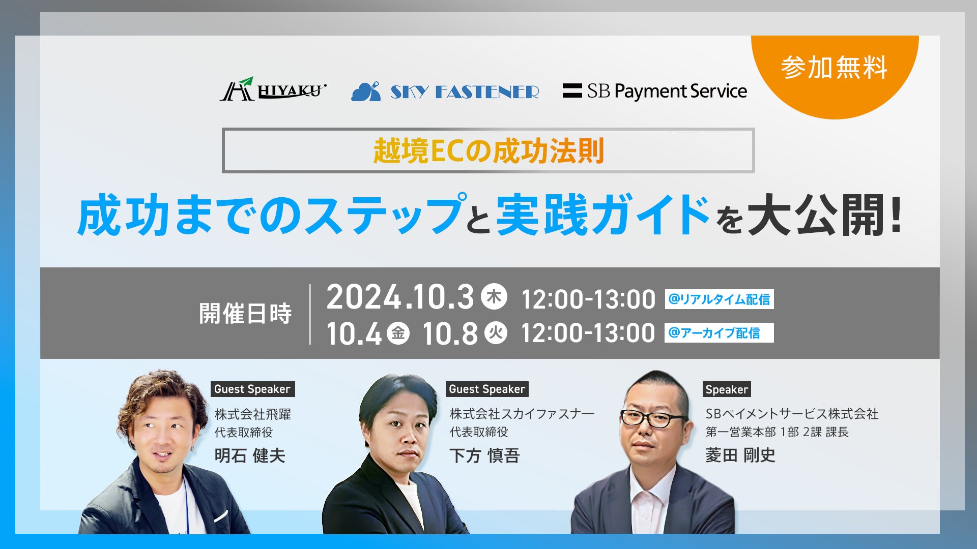 本セミナーでは越境ECの構築・運営実績が100社以上の弊社と決済代行サービスを提供するSBペイメントサービス株式会社、台湾向け越境ECサービスを展開する株式会社スカイファスナーの3社が登壇します。