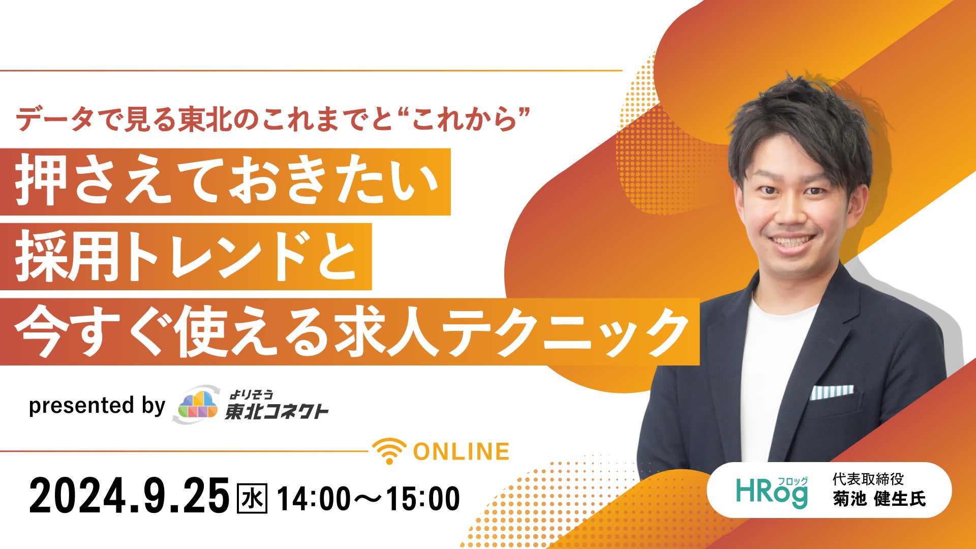 本ウェビナーでは、求人ビッグデータを活用したサービス展開や、HR業界特化メディア「HRog」の運営を行う株式会社フロッグより菊池 健生氏をお招きし、40億件を越えるビッグデータを裏付けとして、東北採用のトレンドを徹底解説いただきます。