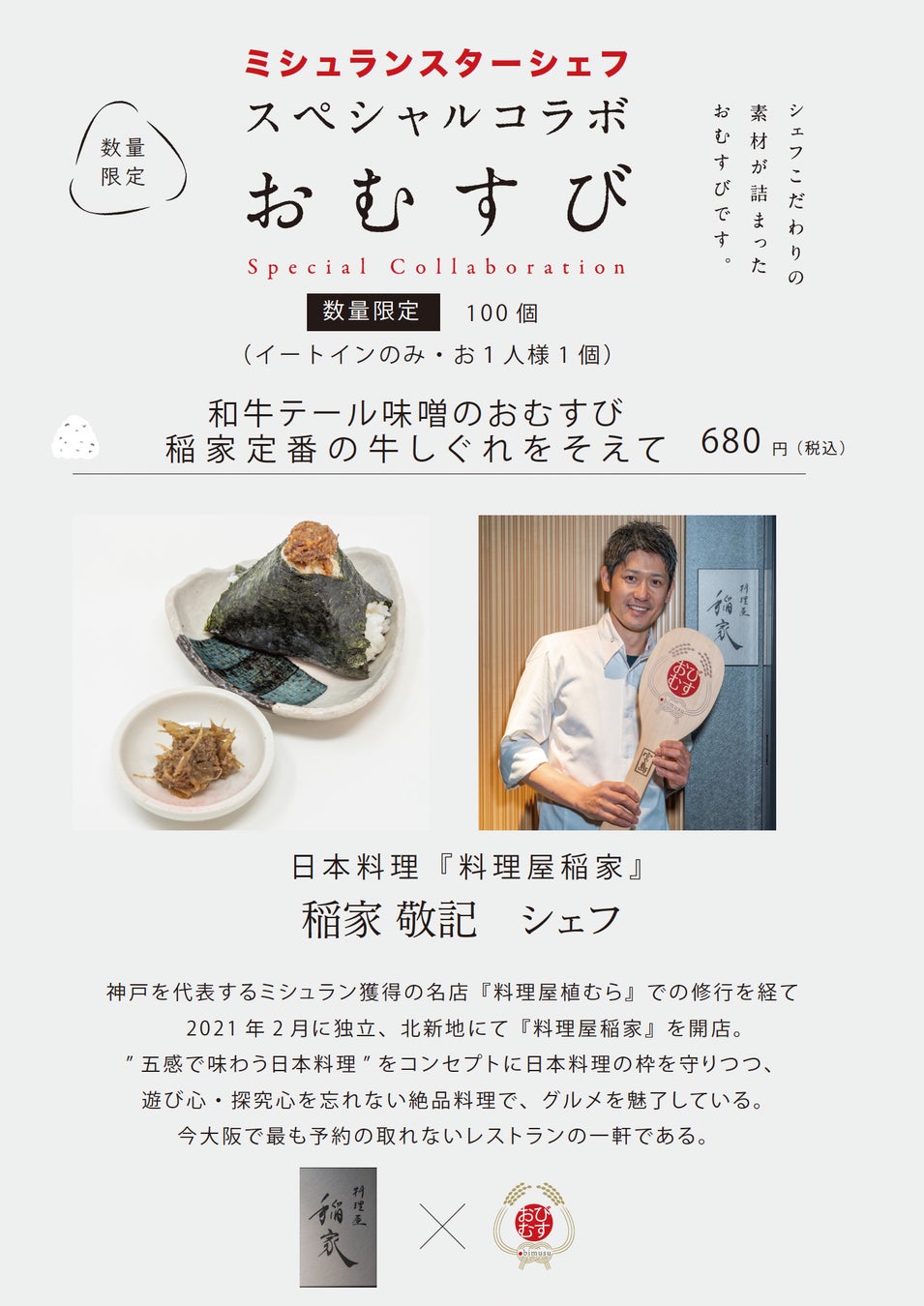 ミシュランスターシェフの手作りおむすび!第六弾は予約の取れない人気店!北新地『料理屋稲家』とのコラボ「和牛テール味噌のおむすび〜稲家定番の牛しぐれをそえて〜」1月10日より数量限定で提供開始