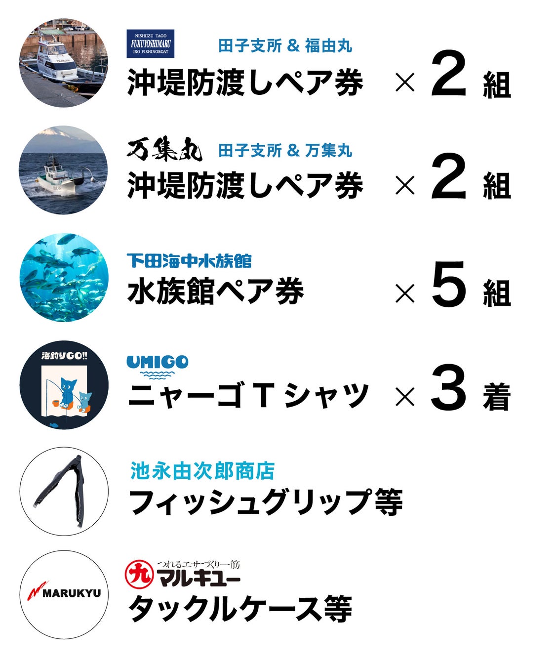 田子支所より、福由丸・万集丸の沖堤防チケット。下田海中水族館より、水族館ペア券、海釣りGOニャーゴTシャツ、池永由次郎商店様よりフィッシュグリップなど堤防釣りで役立つ便利グッズ、マルキュー様よりタックルケースやレジャーシートなどすぐに使えるお役立ちアイテム。その他も、たくさんの景品をご用意しております!