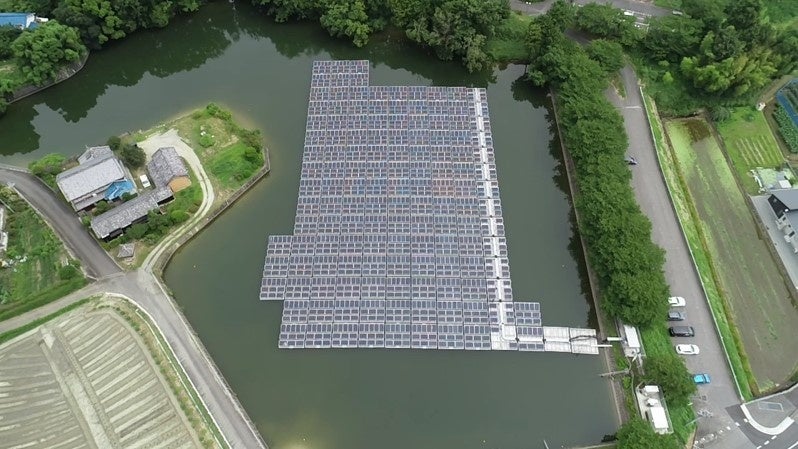 フロート型太陽光発電はため池などの水上に太陽光パネルを設置することで発電を行います。また、太陽光パネルは夏場の高温時に発電効率が下がりますが、フロート発電の場合は水面の水冷効果により太陽光パネルの温度上昇が抑えられるため、発電効率が上がります。さらに、ため池を活用することで森林を伐採する必要がなく、太陽光を池から遮ることで水の蒸発を防ぎ、渇水対策や藻類の繁殖抑制にもつながるなど、環境を保全しながらの発電が可能となります。