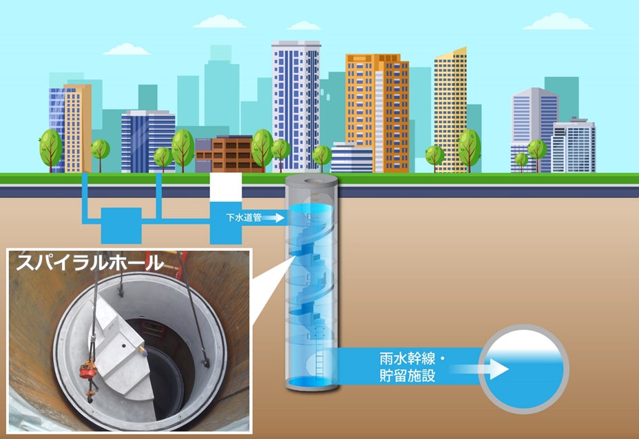 近年は降雨量の増加により、地上近くに埋設された地下水路だけでは雨水を処理しきれないケースが増えています。その対策の一つとして整備が進められているのが、大深度の地下河川水路です。しかし、この水路へ雨水を流入させる際には、流量の確保、騒音防止、維持管理など、多くの課題がありました。こうした課題に対し、当社は、水を旋回させながらスムーズに流す独自技術を活かした「スパイラルホール」を開発しました。