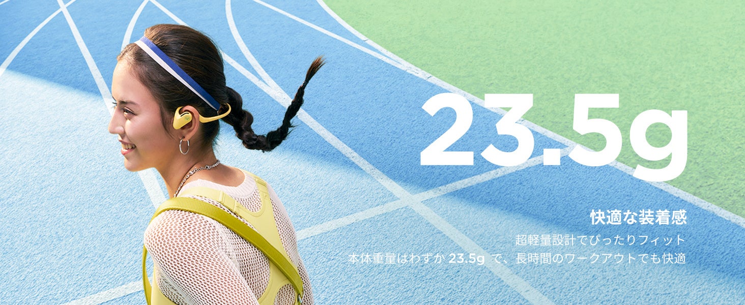 本体重量はわずか23.5gでイヤホンを耳に掛けるだけです。耳を塞がない為、装着時の違和感がありません。長時間装着しても、付けていることを忘れるほどです。
