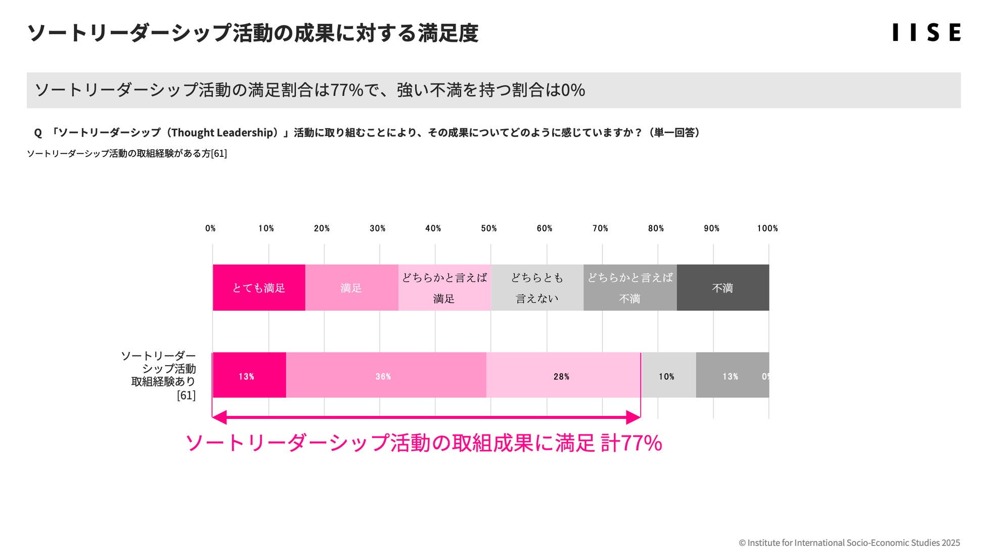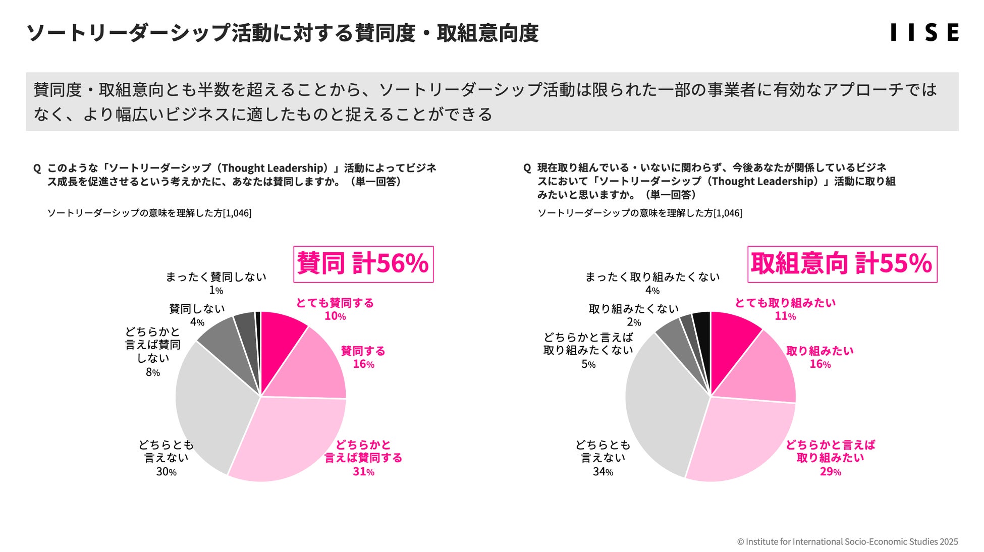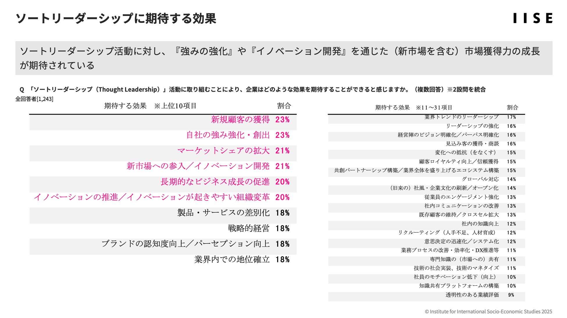ソートリーダーシップは、新しい考え方を世の中に提示し、共感によりステークホルダーを共創へ誘引することで、新たな顧客や市場を創造するマーケティング手法の一つであるため、上記課題の解決において有効であり、IISEでもソートリーダーシップ活動を推進しています。
