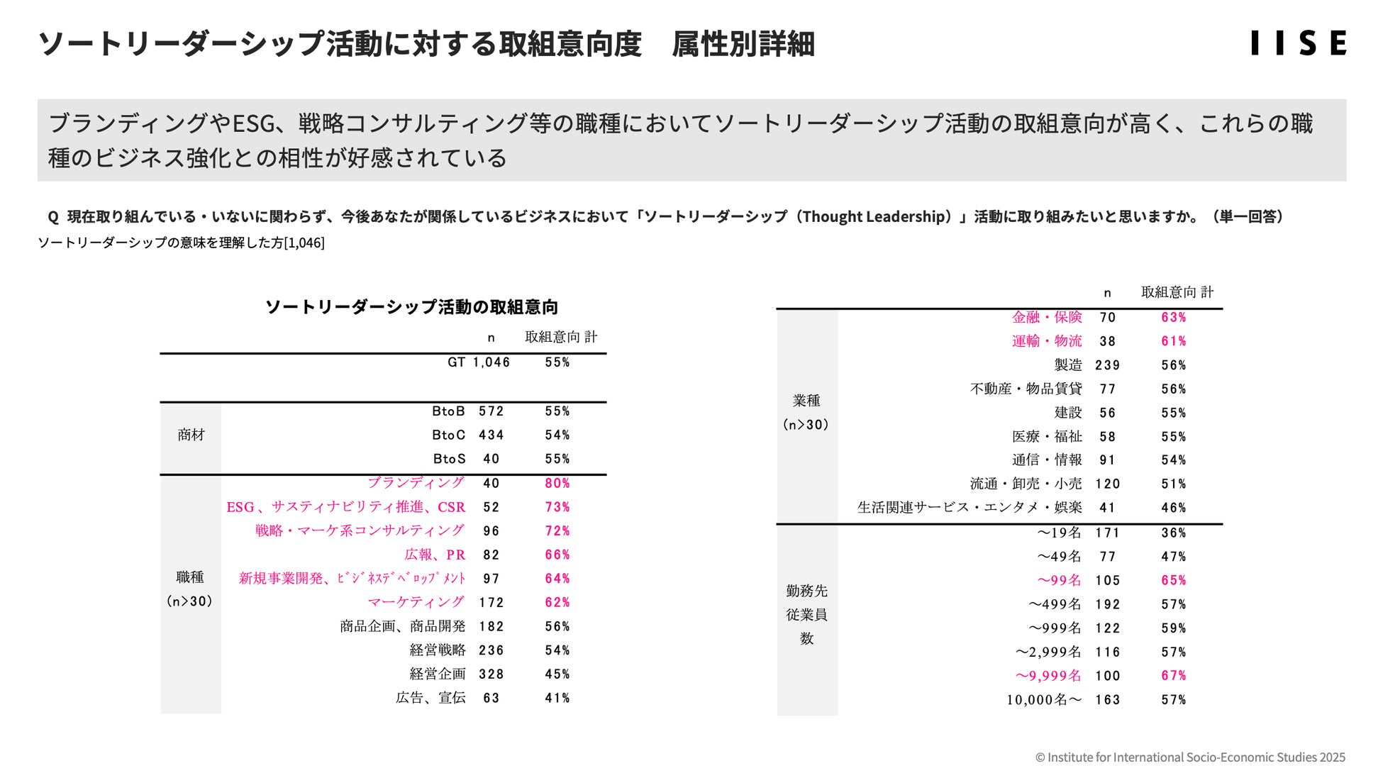 ソートリーダーシップ活動への今後の取組意向は55%。ブランディング職は8割、マーケティング職やビズデブ職は6割を大きく超える